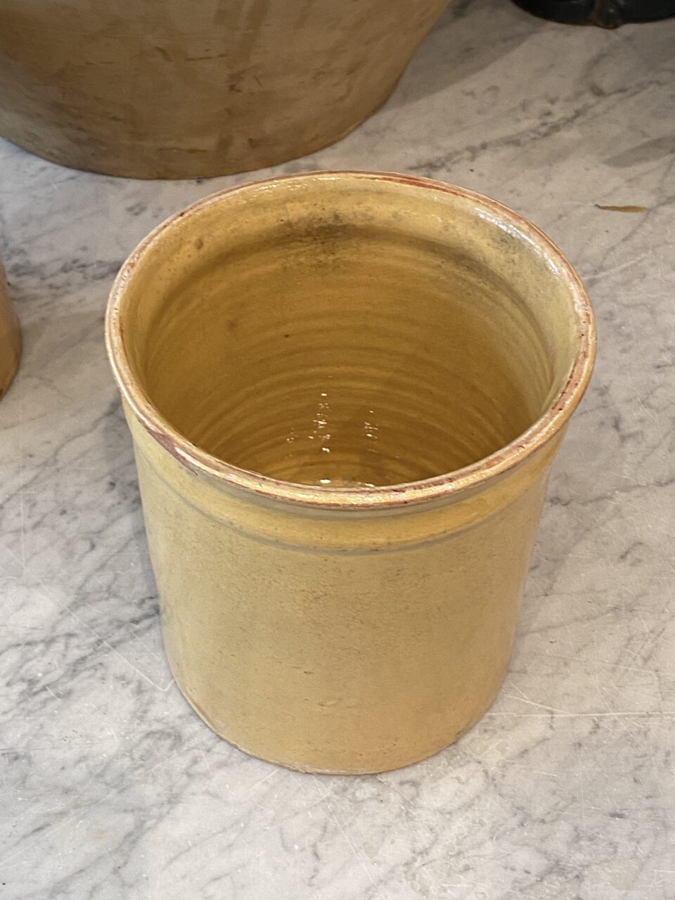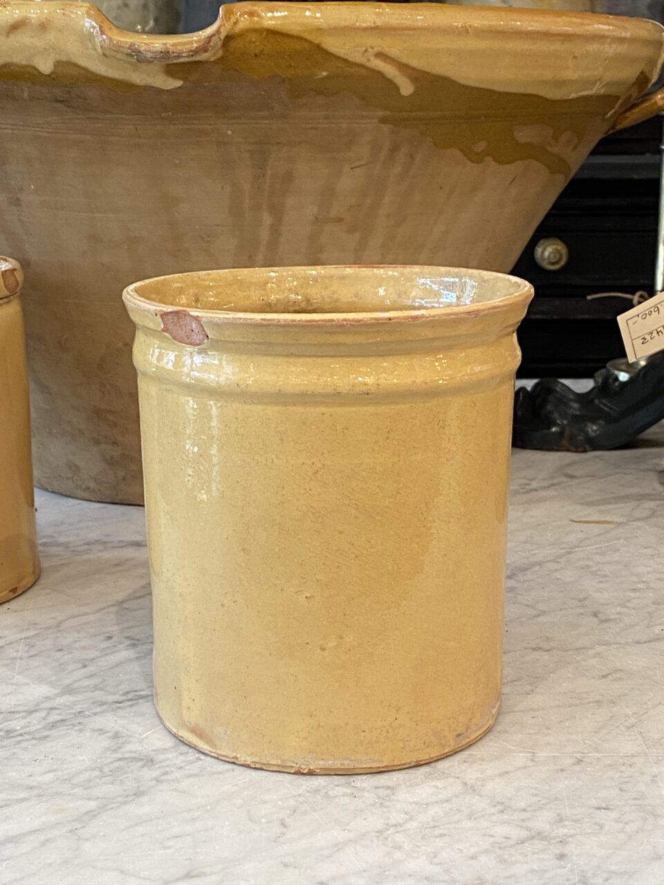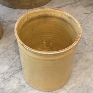 Gammel fransk stor håndlavet cylinderformet lertøjskrukke, med smuk gullig glasur, som stammer fra Lyon i Frankrig, ca. år 1900. Krukken har tidligere været brugt til marmeladeproduktion og kastanjecreme.