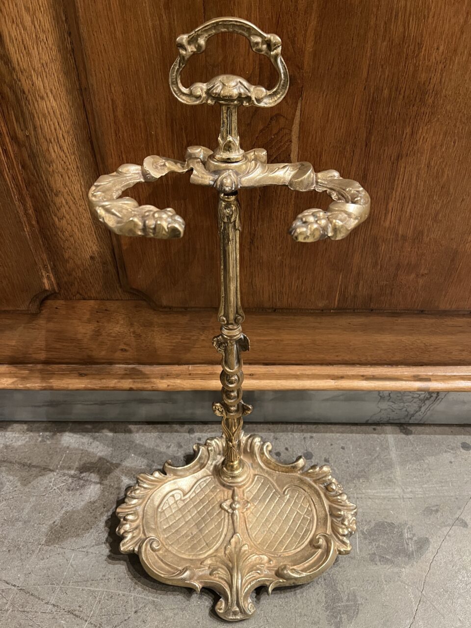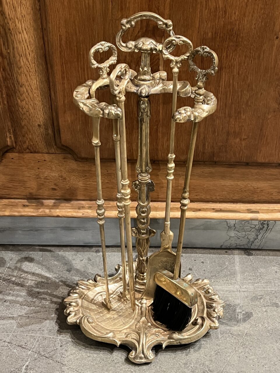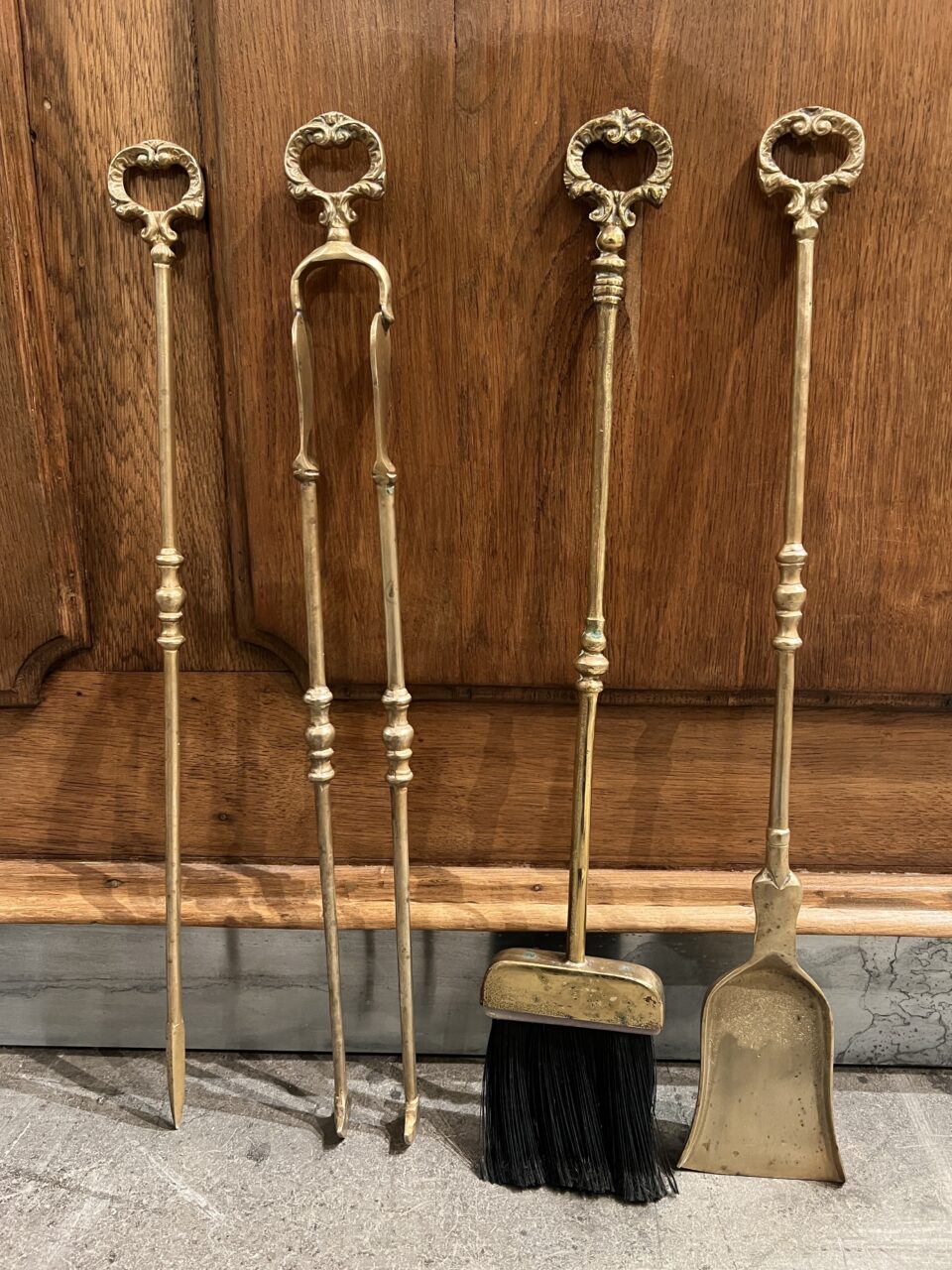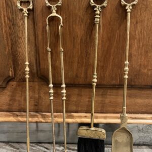Antikt fransk pejsesæt i massiv messing, med en fantastisk patina.