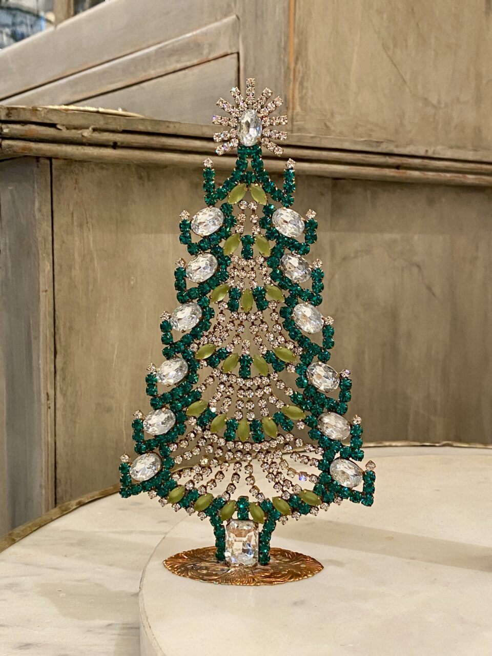 Disse fine håndlavet juletræer er pyntet med gamle farvestrålende rhinsten og krystaller af glas i forskellige mønstre og farver, så hvert et træ er unikt.
