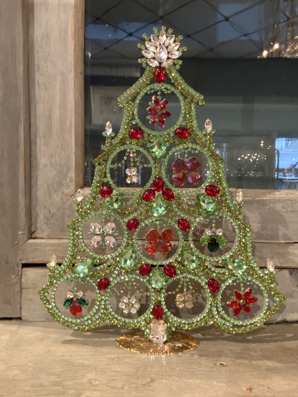 Disse fine håndlavet juletræer er pyntet med gamle farvestrålende rhinsten og krystaller af glas i forskellige mønstre og farver, så hvert et træ er unikt.