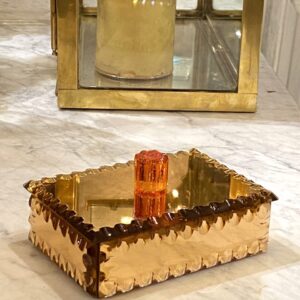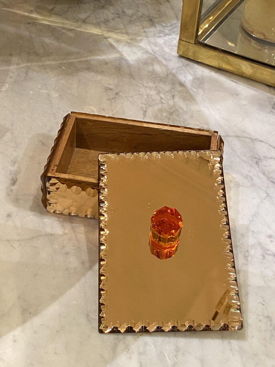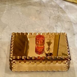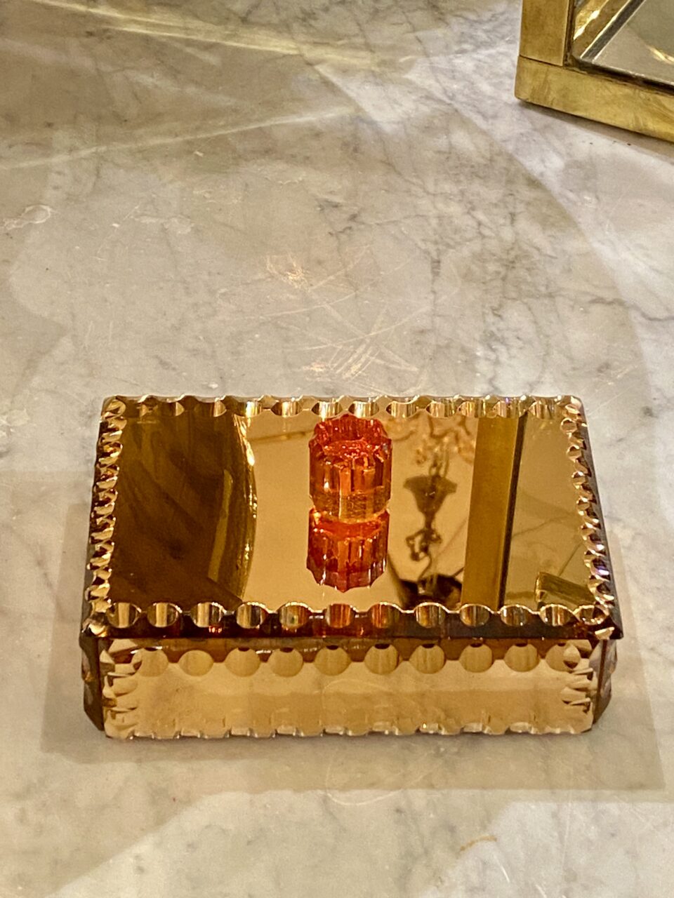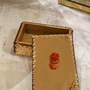 Elegant gammelt fransk smykkeskrin i fra 1930’erne i kobberfarvet spejlglas med glasknop på låget.