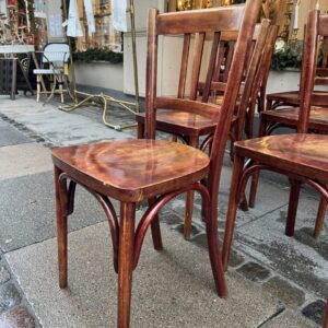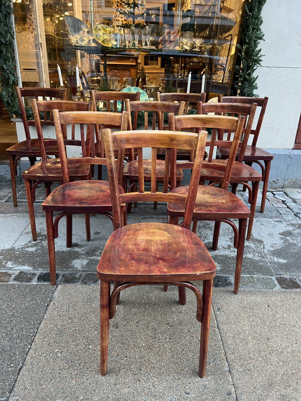 Den gamle wienerstol er i formbøjet bøgetræ, med en nylakeret overflade, samt brugsspor i træet.