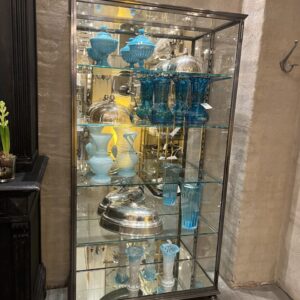 Skabet hviler smukt på elegante ben, og skabet er udstyret med spejlglas på bagside og i bunden, samt 4 glashylder .