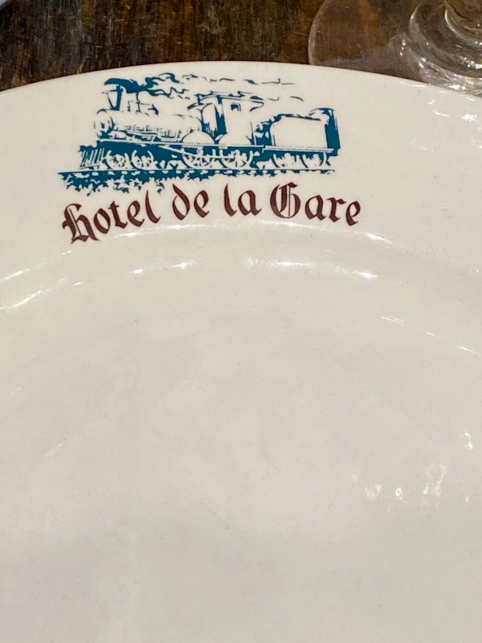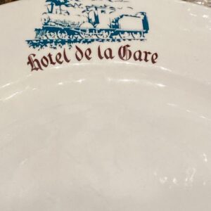 Tallerknen er fint dekoreret med lokomotiv i flaskegrøn og hotel navn i rødbrun farve.