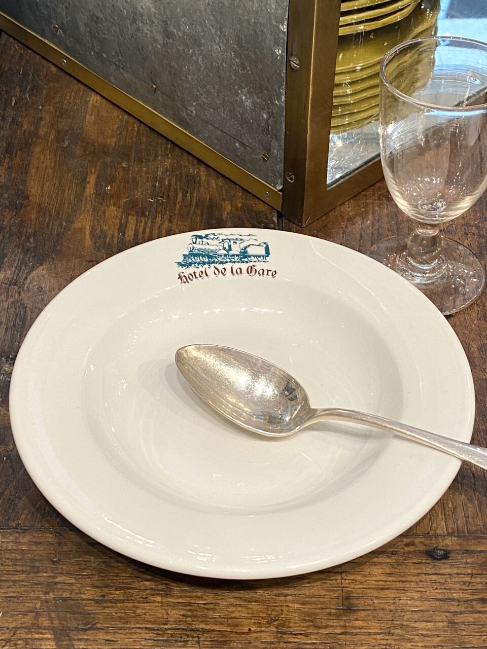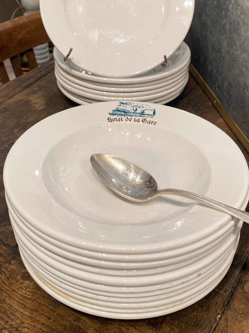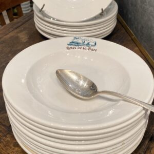 Charmerende gammel fransk bistro suppetallerken fremstillet Jern Porcelæn, som stammer fra et hotel i Frankrig.
