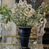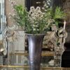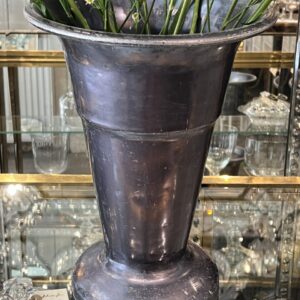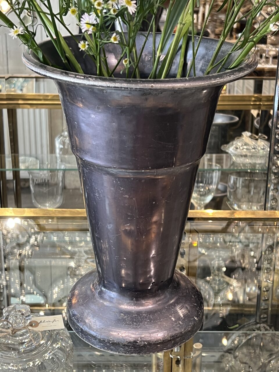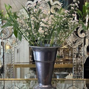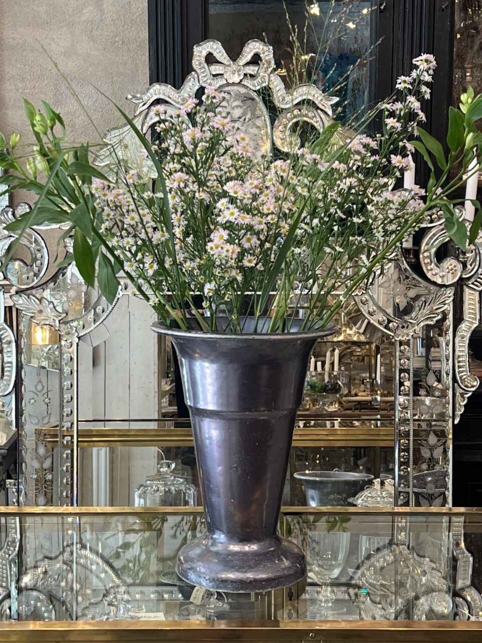 Stor gammel fransk blomsterhandlervase fra Lyon i flot mørk sølv-blå finish fremstillet i aluminium. Vasen er i en form, hvor dine afskårne blomster falder flot og den er tungt læstet i bunden, så den kan klare at stå med længere grene.