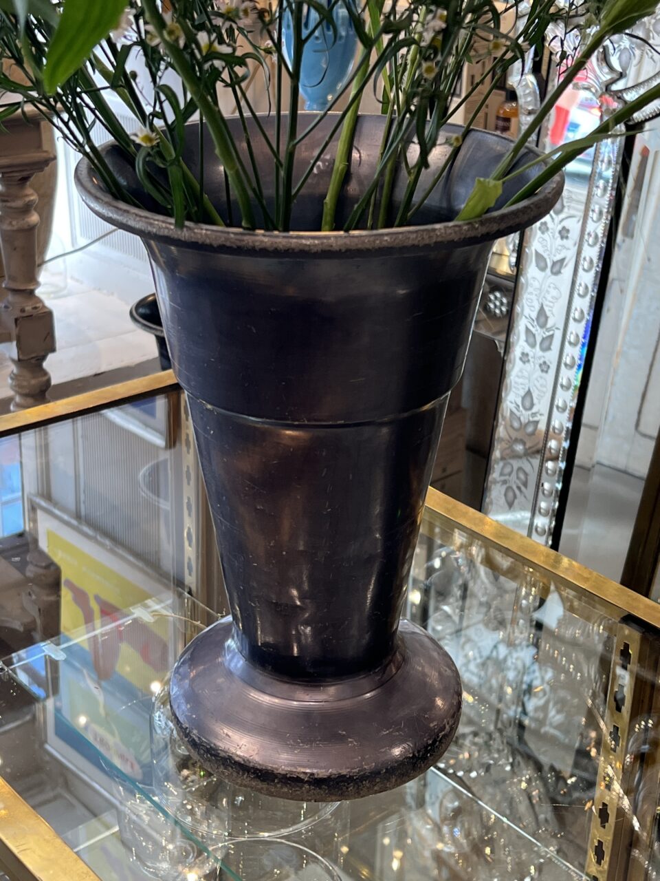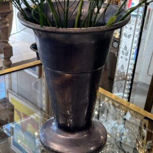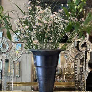 Stor gammel fransk blomsterhandlervase fra Lyon i flot mørk sølvblå finish fremstillet i aluminium. Vasen er i en form, hvor dine afskårne blomster falder flot og den er tungt læstet i bunden, så den kan klare at stå med længere grene.