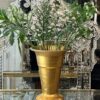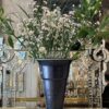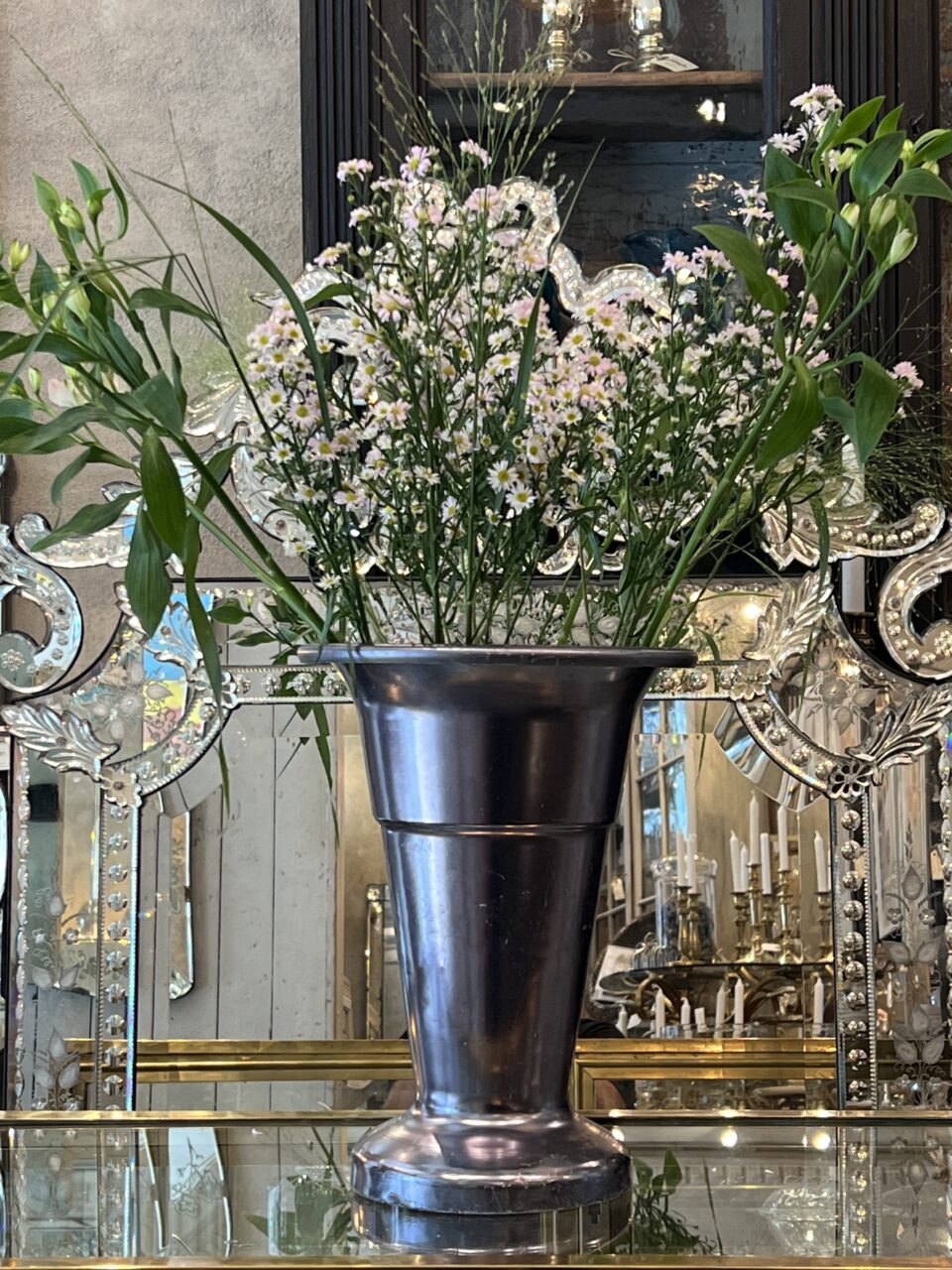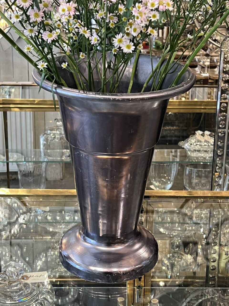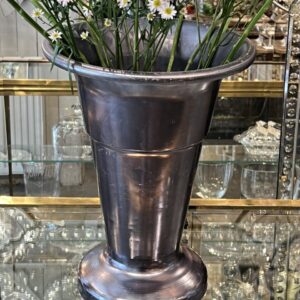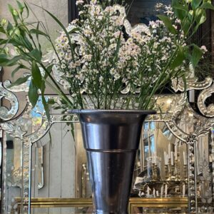 Stor gammel fransk blomsterhandlervase fra Lyon i flot mørk blank sølvfarvet finish fremstillet i aluminium. Vasen er i en form, hvor dine afskårne blomster falder flot og den er tungt læstet i bunden, så den kan klare at stå med længere grene.