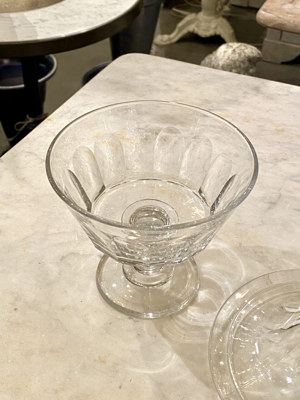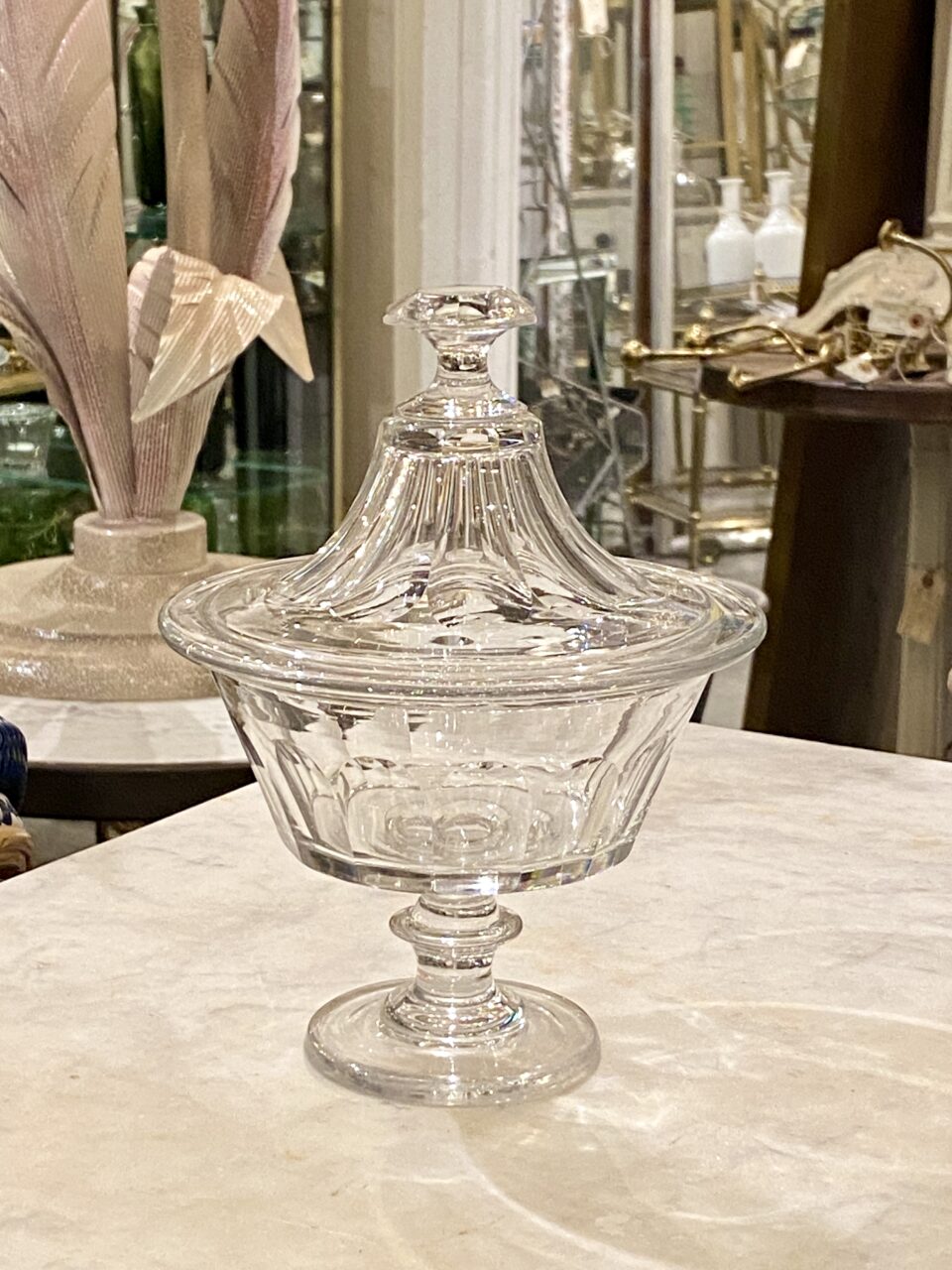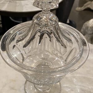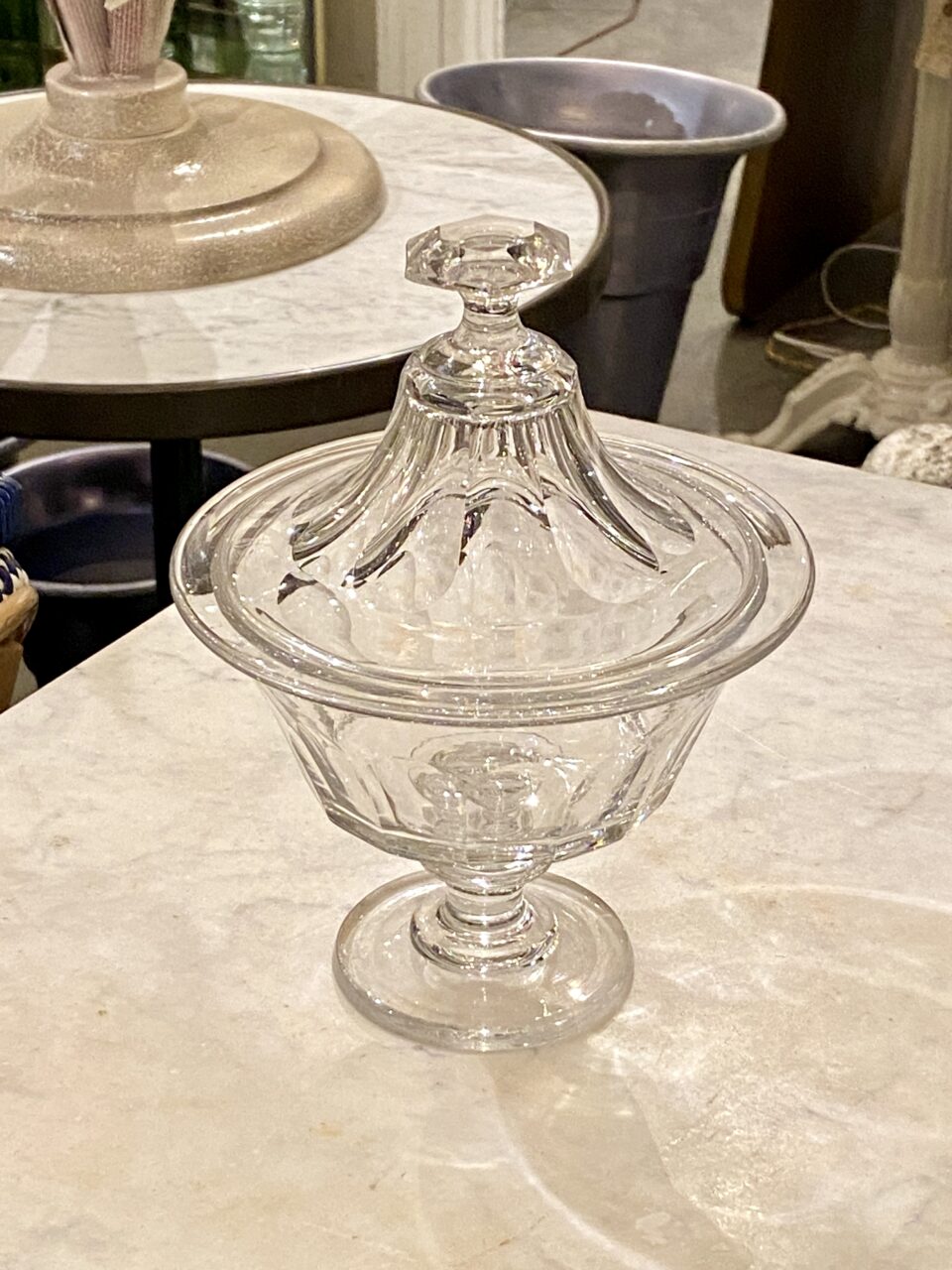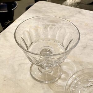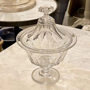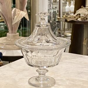 Antik fransk glasopsats med låg, også kaldet en Drageoir af franskmændene, som oprindeligt er blevet benyttet til at fremvise dragée i – på dansk chokolademandler med sukkerovertræk – dengang chokolade var dyrt og eftertragtet, så der var prestige i at vise sit slik frem for gæsterne.