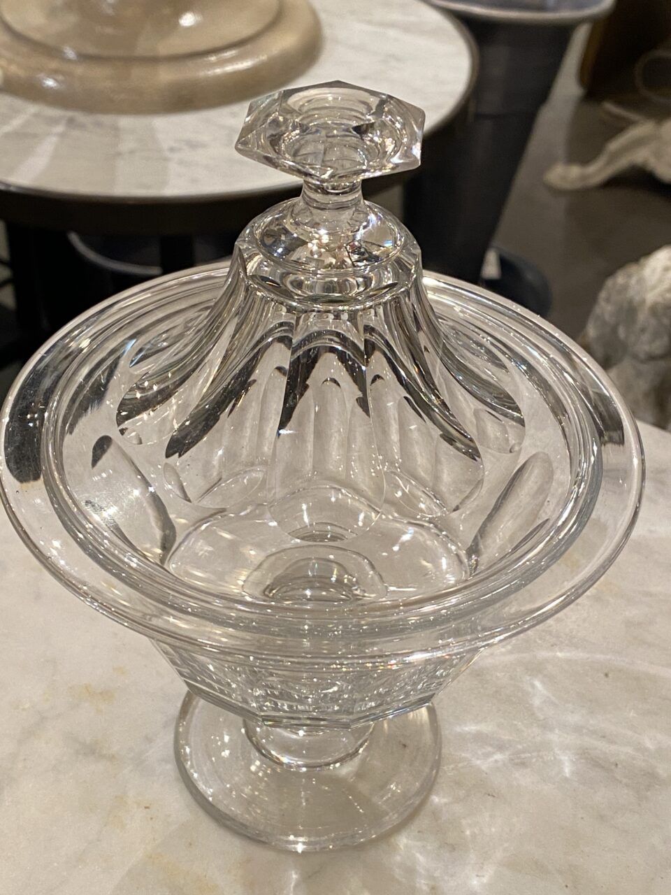Glasopsatsen er elegant hævet op på fod og lågklokke med knop. Opsatsen er fremstillet i krystalglas med flotte facetslibninger og stammer fra før 1890’erne.