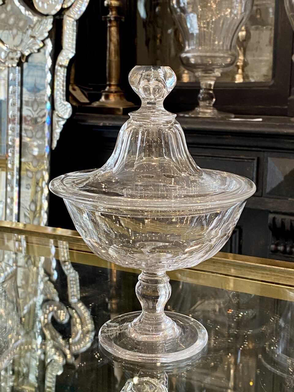 Glasopsatsen er elegant hævet op på fod og lågklokke med knop. Opsatsen er fremstillet i krystalglas med flotte facetslibninger og stammer fra før 1890’erne.