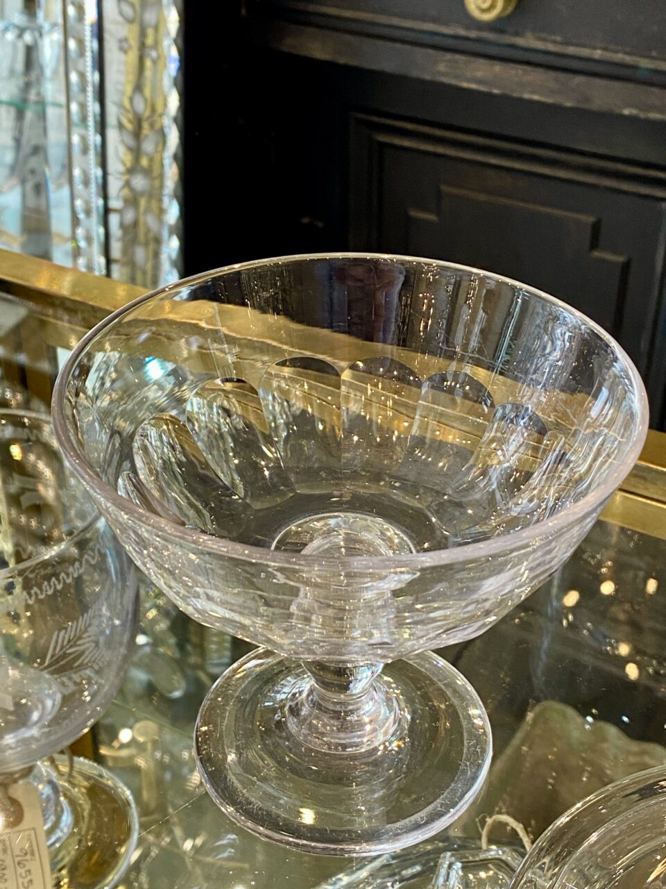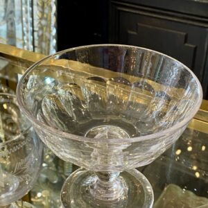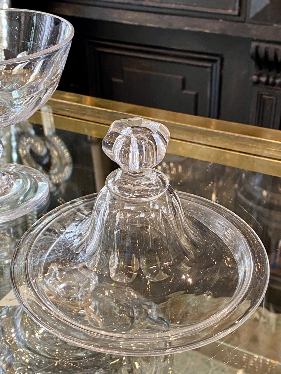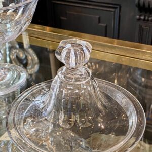 Antik fransk glasopsats med låg, også kaldet en Drageoir af franskmændene, som oprindeligt er blevet benyttet til at fremvise dragée i – på dansk chokolademandler med sukkerovertræk – dengang chokolade var dyrt og eftertragtet, så der var prestige i at vise sit slik frem for gæsterne.