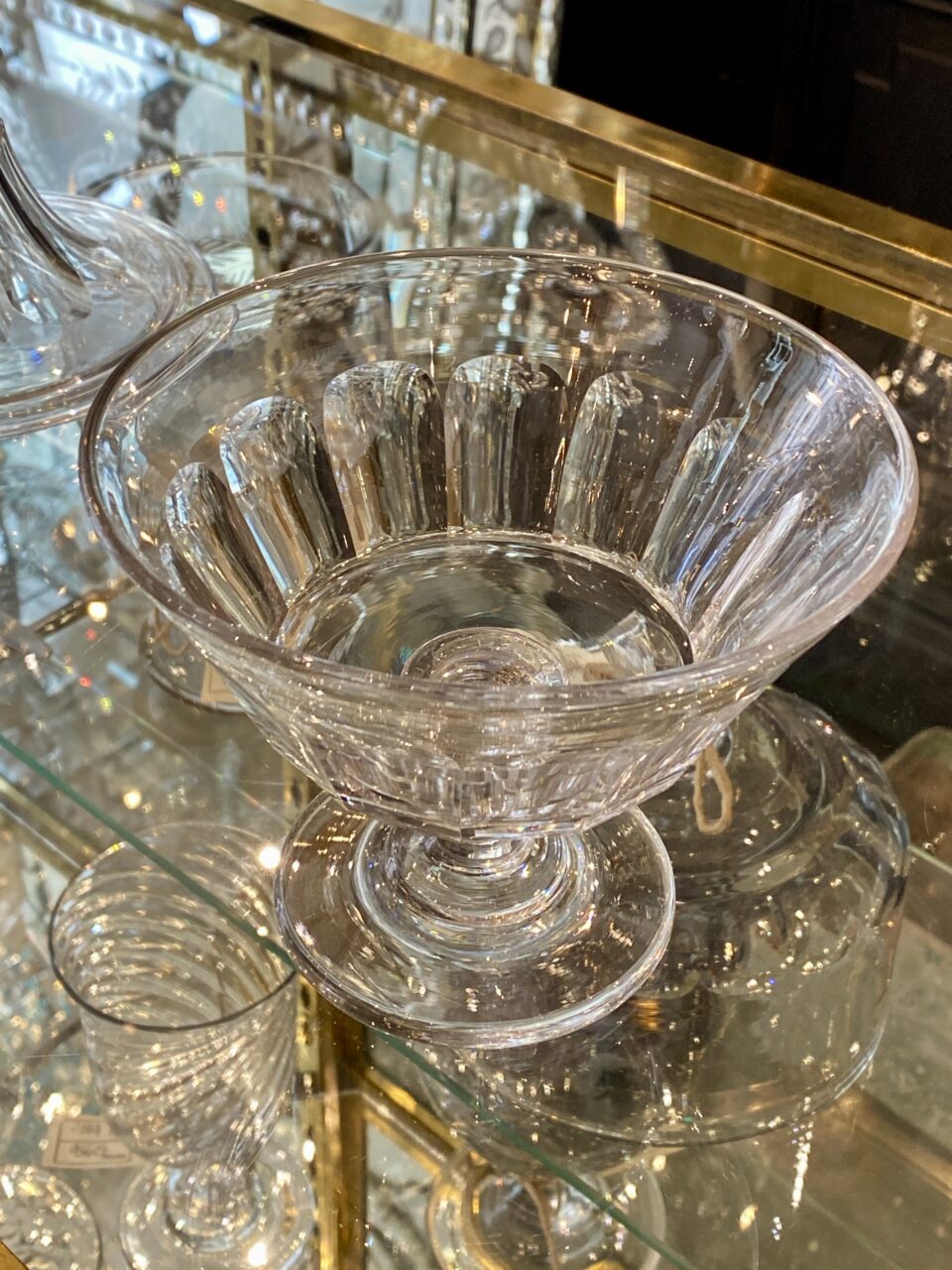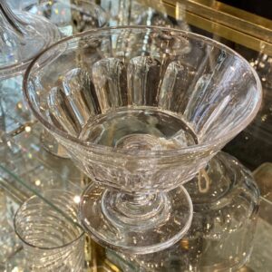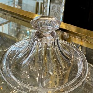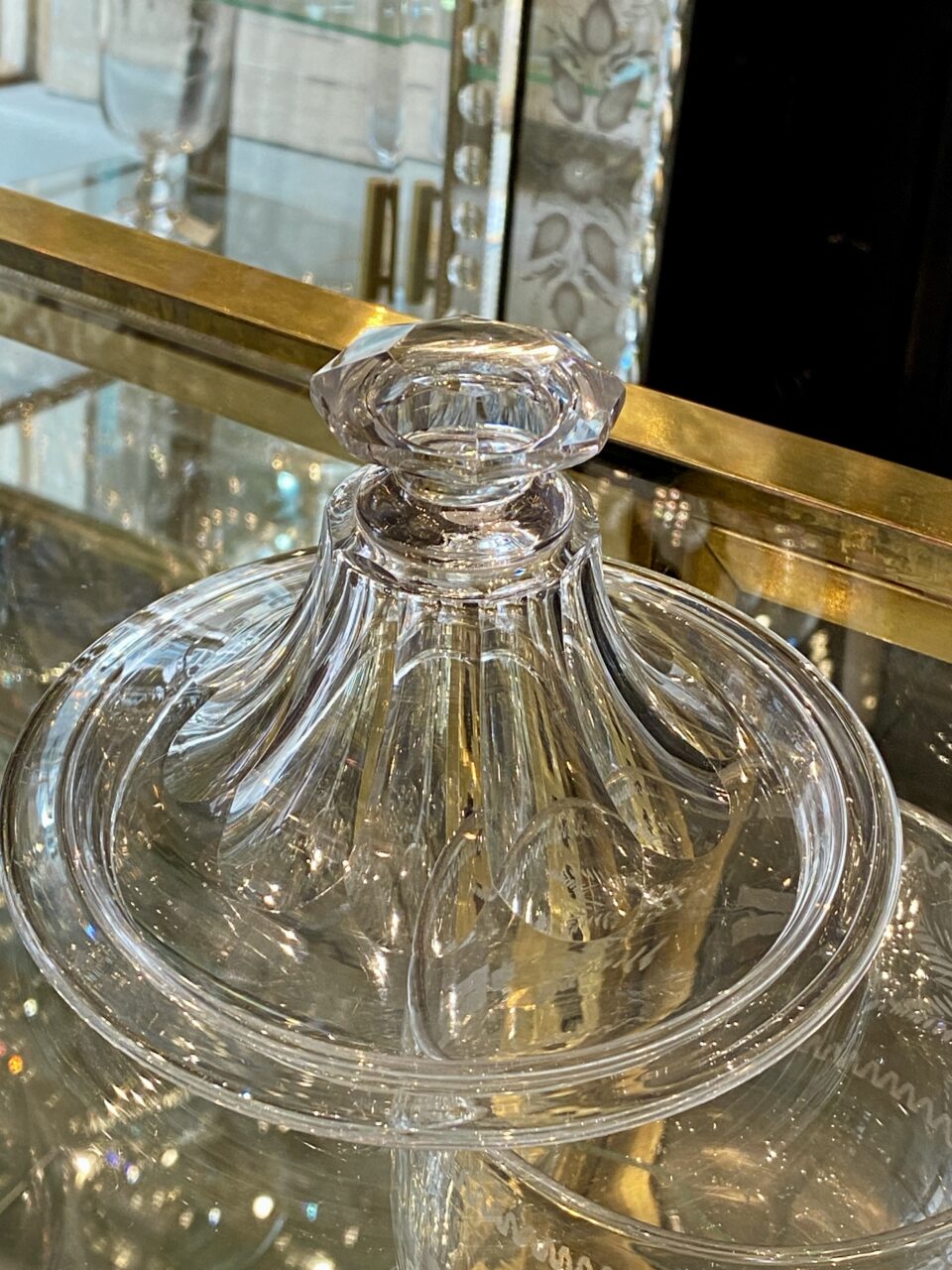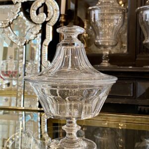 Glasopsatsen er elegant hævet op på fod og lågklokke med knop. Opsatsen er fremstillet i krystalglas med flotte facetslibninger og stammer fra før 1890’erne.