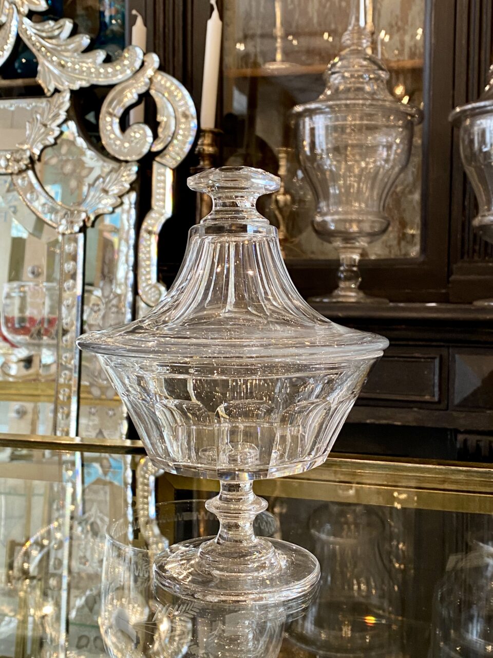 Antik fransk glasopsats med låg, også kaldet en Drageoir af franskmændene, som oprindeligt er blevet benyttet til at fremvise dragée i – på dansk chokolademandler med sukkerovertræk – dengang chokolade var dyrt og eftertragtet, så der var prestige i at vise sit slik frem for gæsterne.