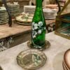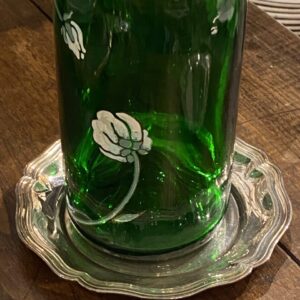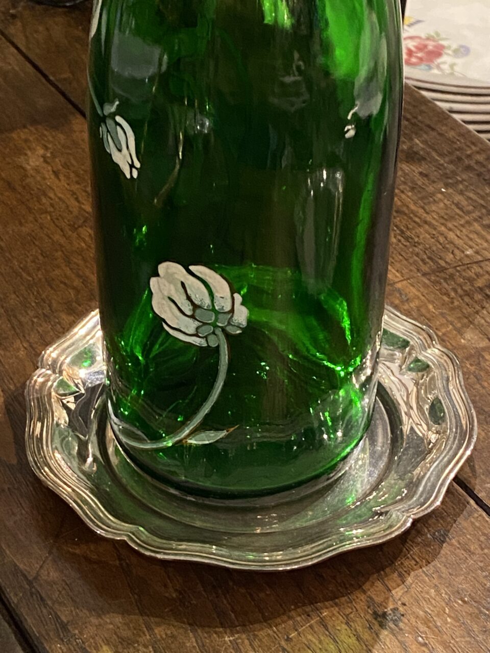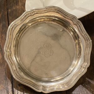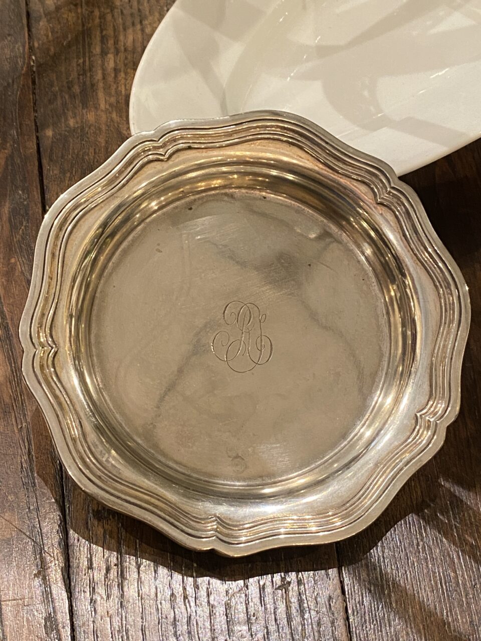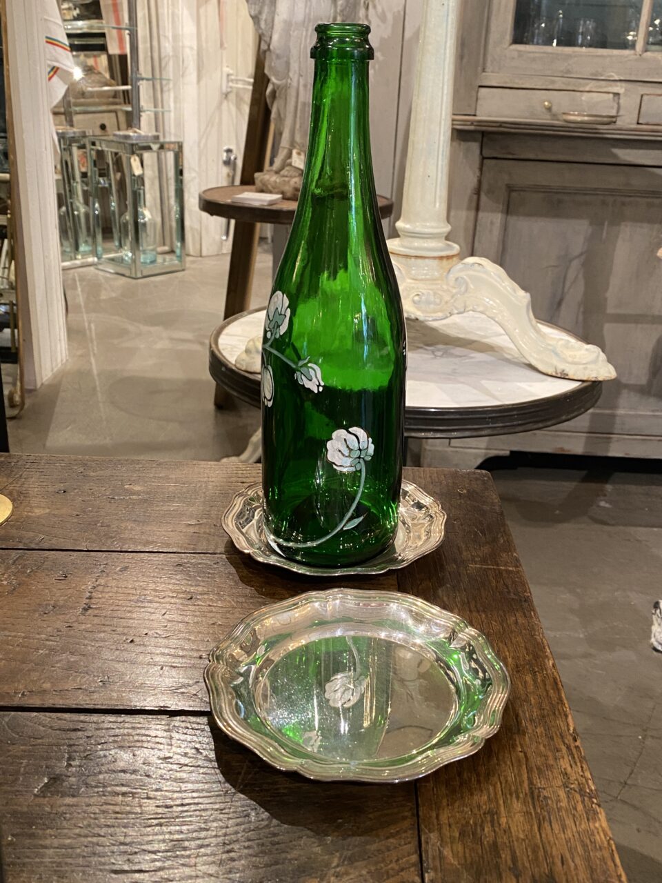 Flot gammel fransk flaskebakke i forsølvet messing. Bakken har en elegant formgivning, med fin dekoreret kant og smukke initialer i bunden.