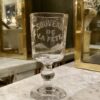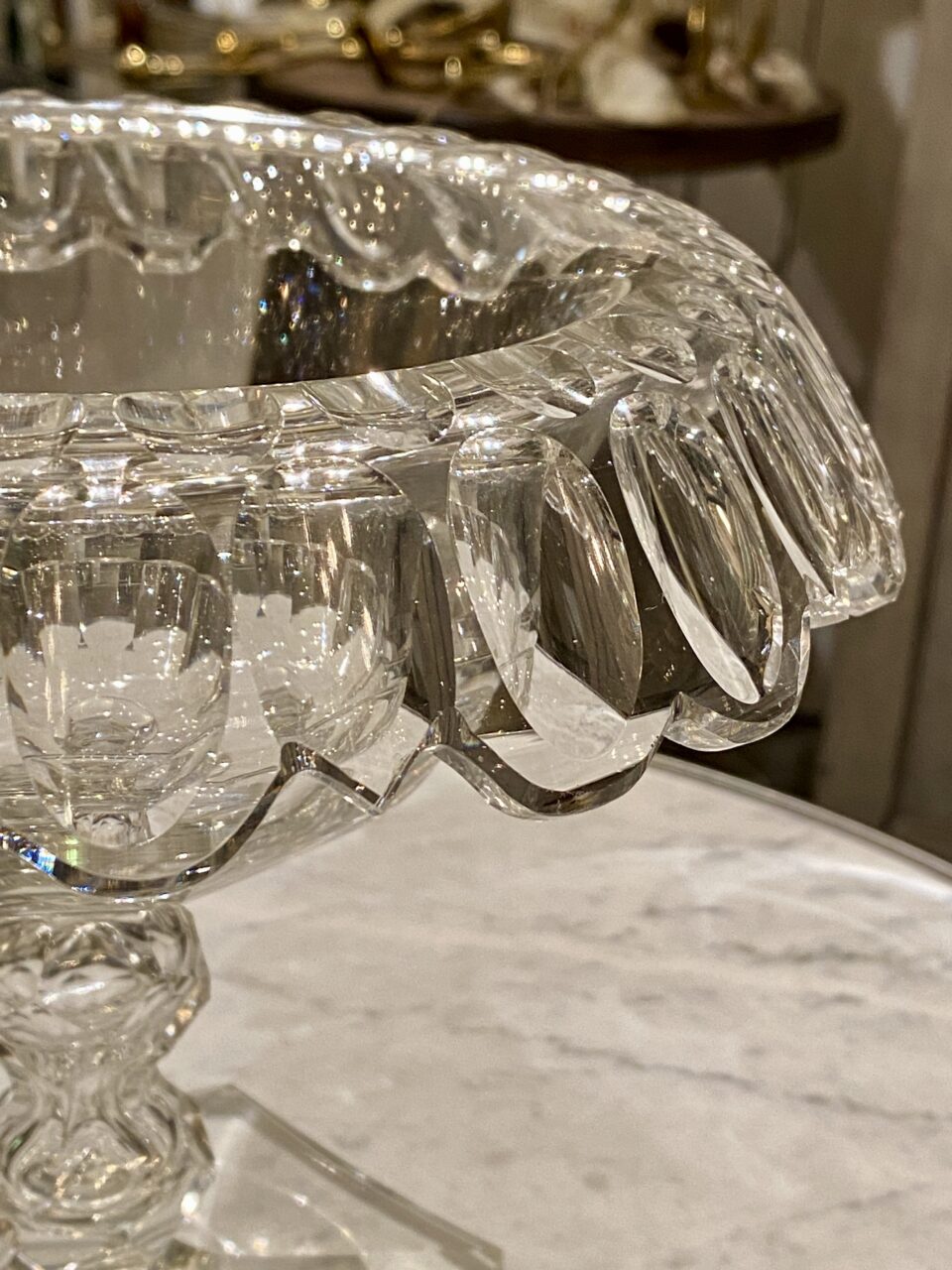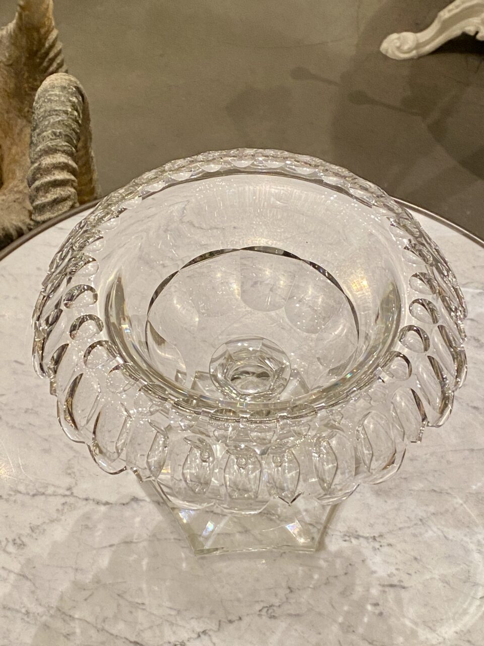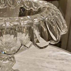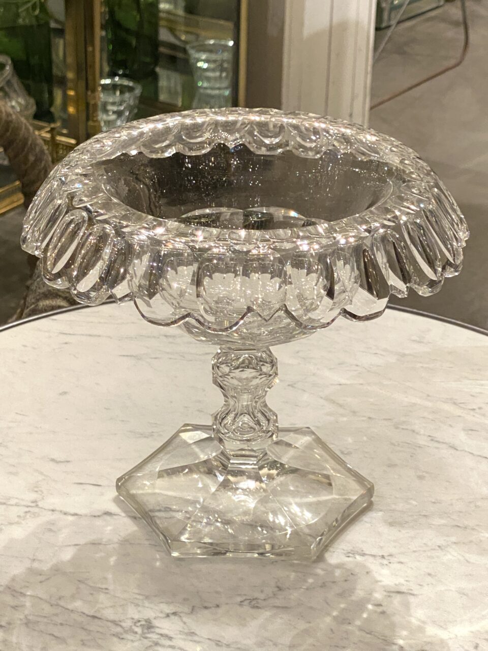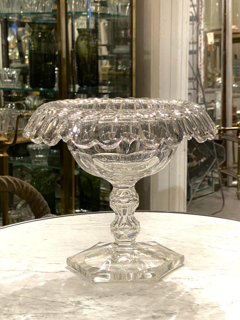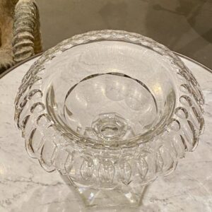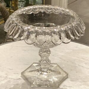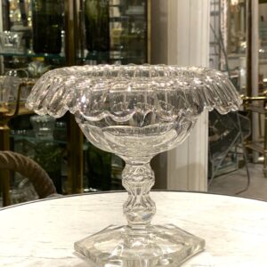 Elegant gammel fransk glasopsats på fod fremstillet i kraftigt krystalglas. Opsatsen er smukt formgivet og dekoreret med facetslibninger, fin dekoreret stilk og seks kantet fod.