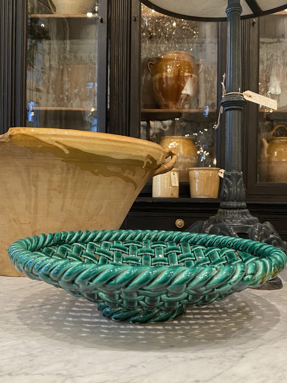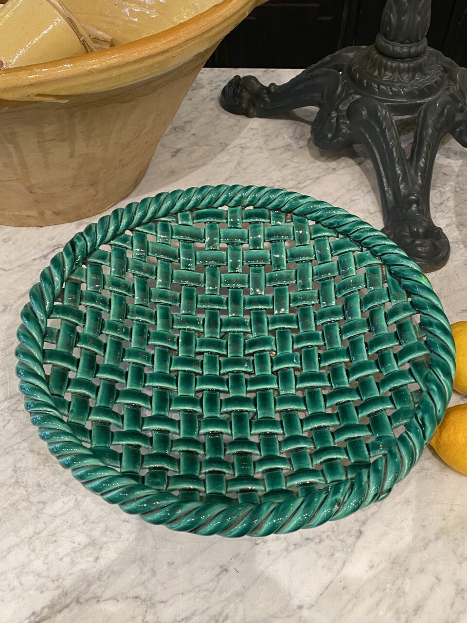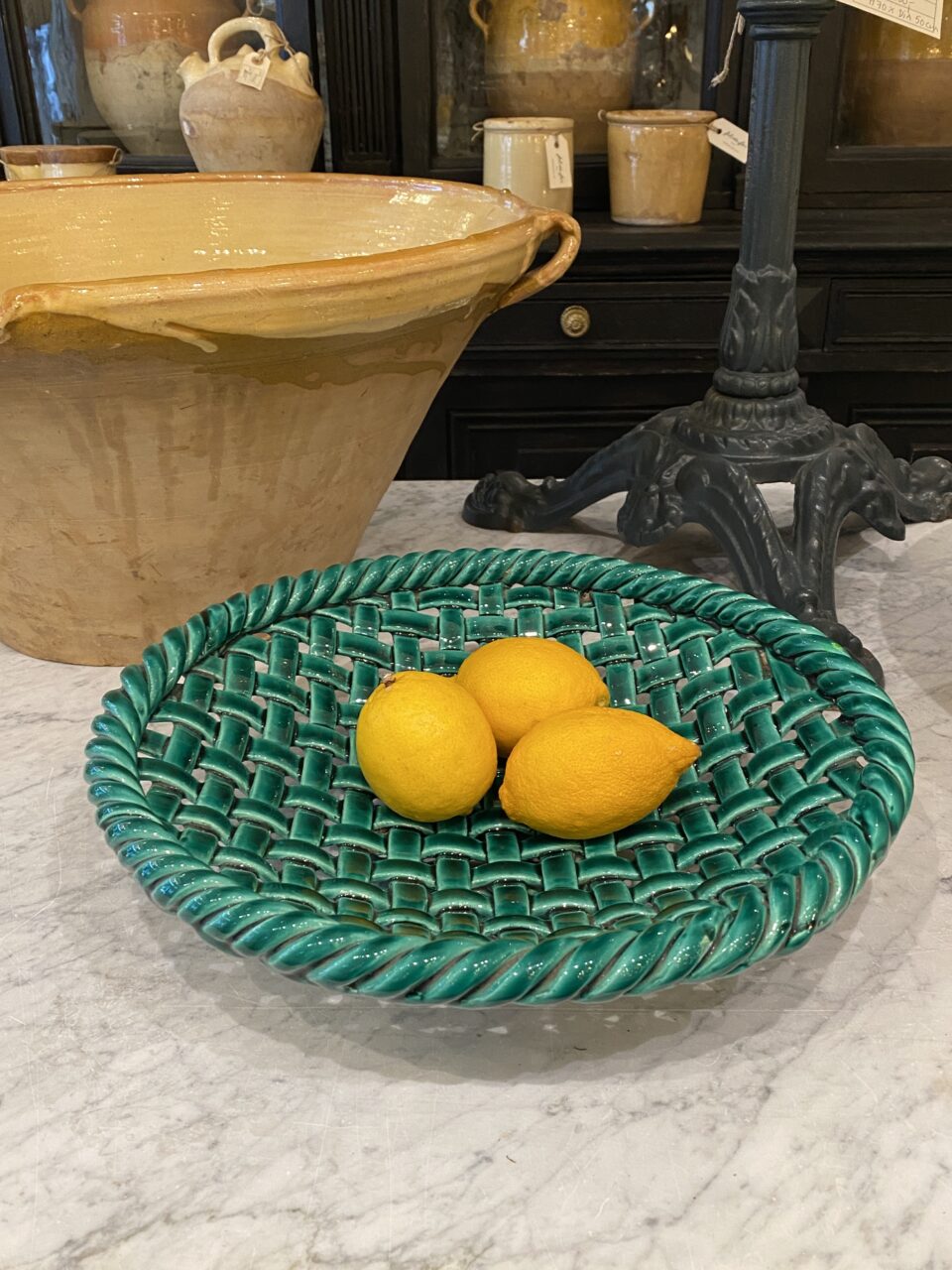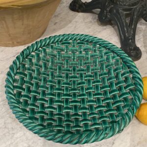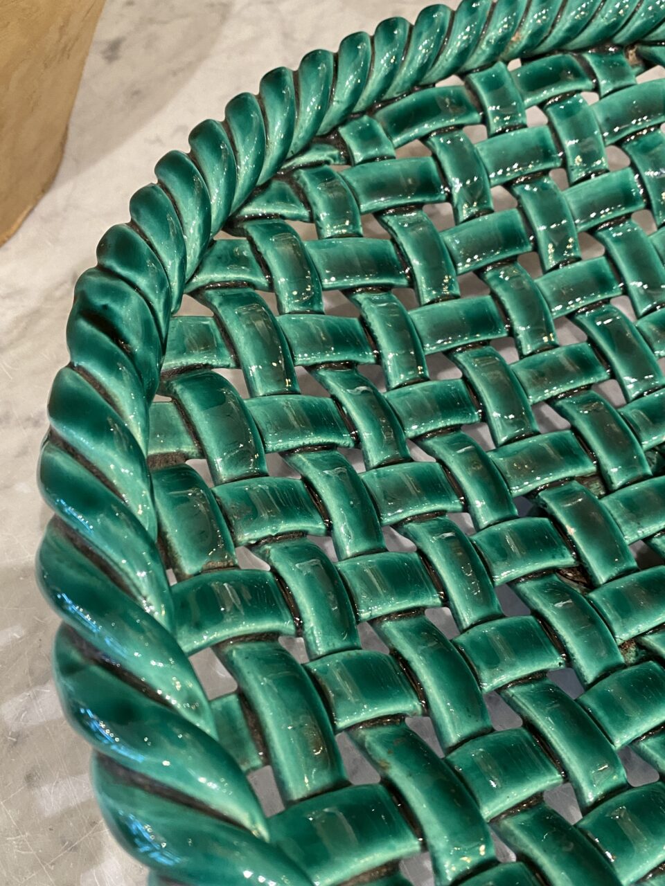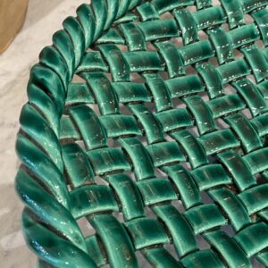 Det smukke fad er glaseret i en dyb smaragdgrøn glasur, som er karakteristisk for mange værker fra denne periode og region.