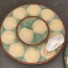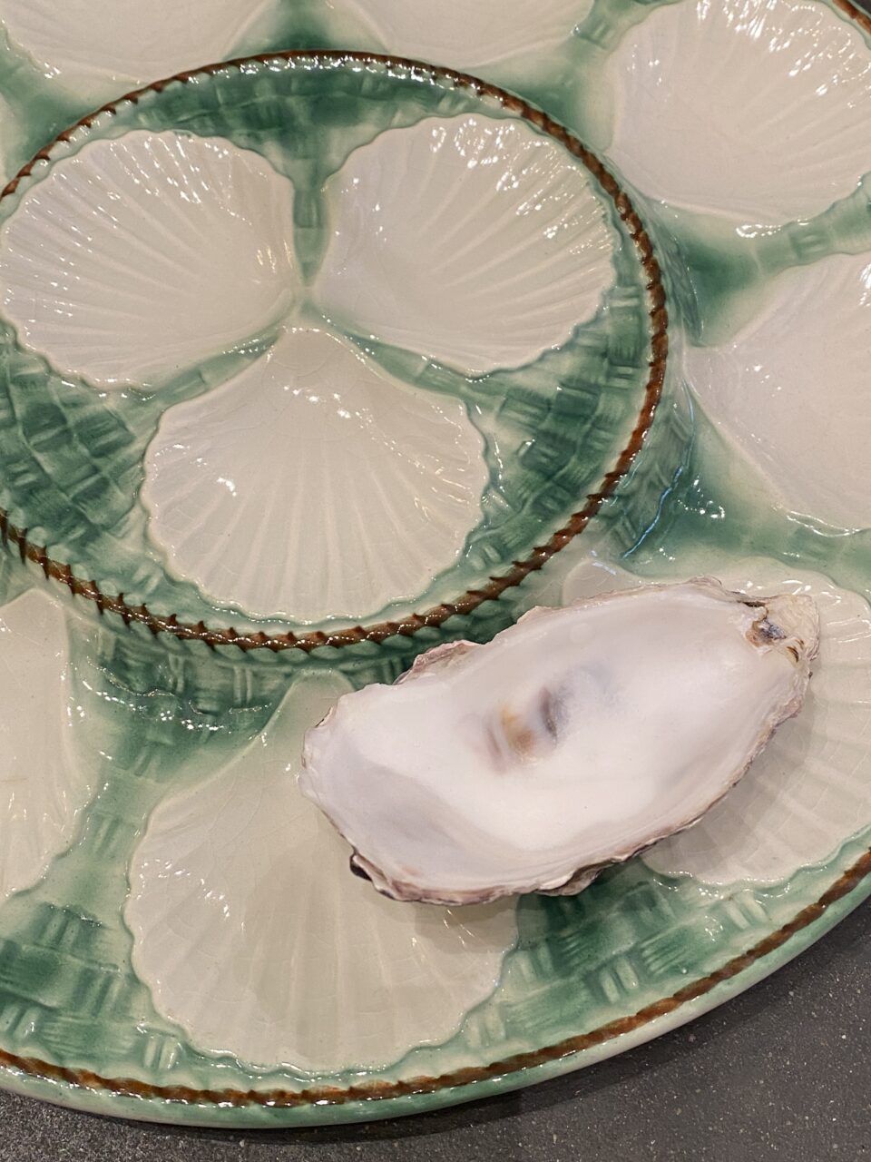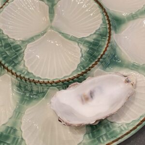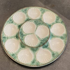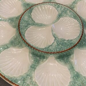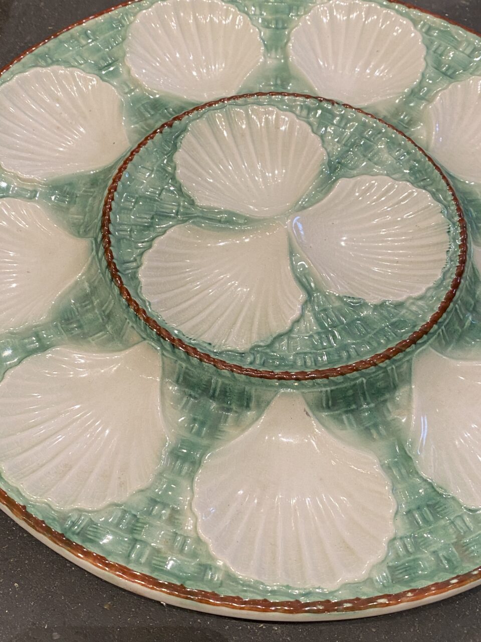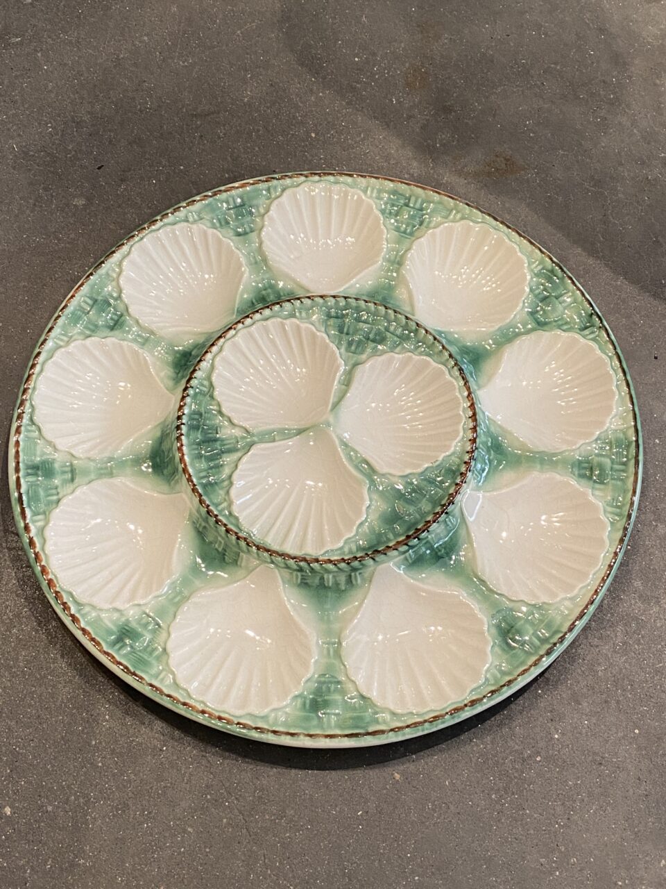 Østersfadet er i det genkendelige klassiske franske look, der fremstår i en grøn og hvid glasur med brunlige kanter.