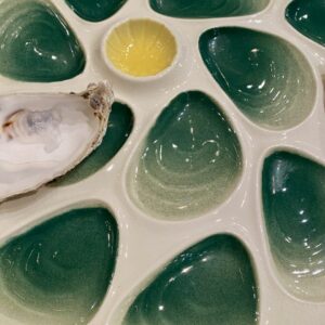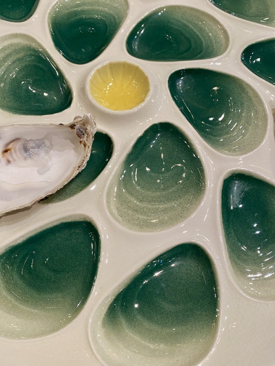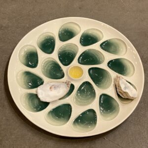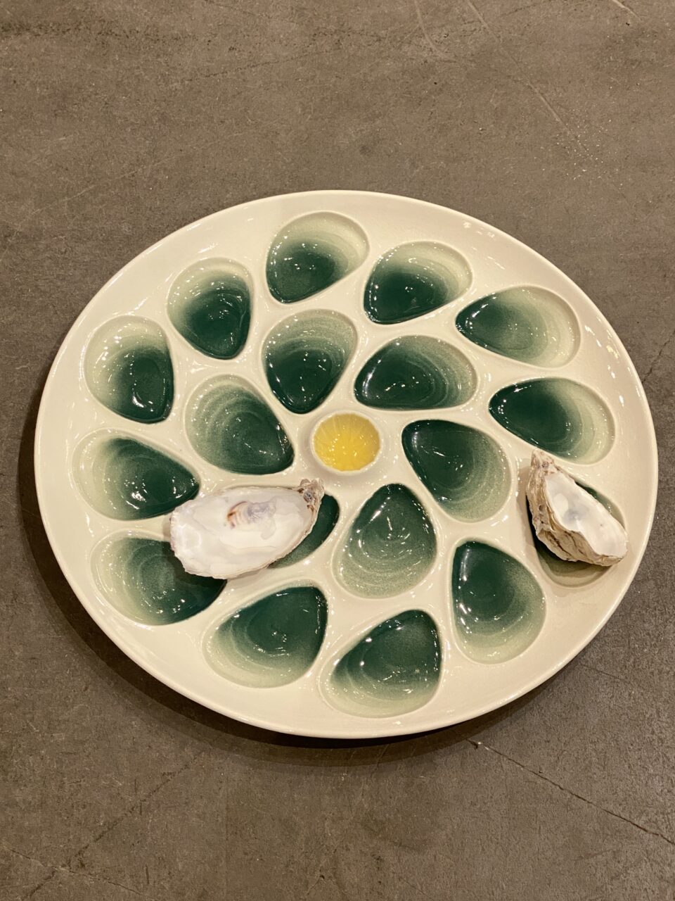 Flot stort opdelt fad til østers og skaldyr, der er fremstillet i fajance med fordybning og med plads til 18 østers. Østersfadet er i enkelt i udtrykket med mørke grønne fordybninger på en cremefarvet fajance og gul midte med plads til citron.