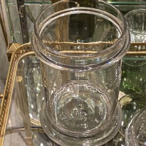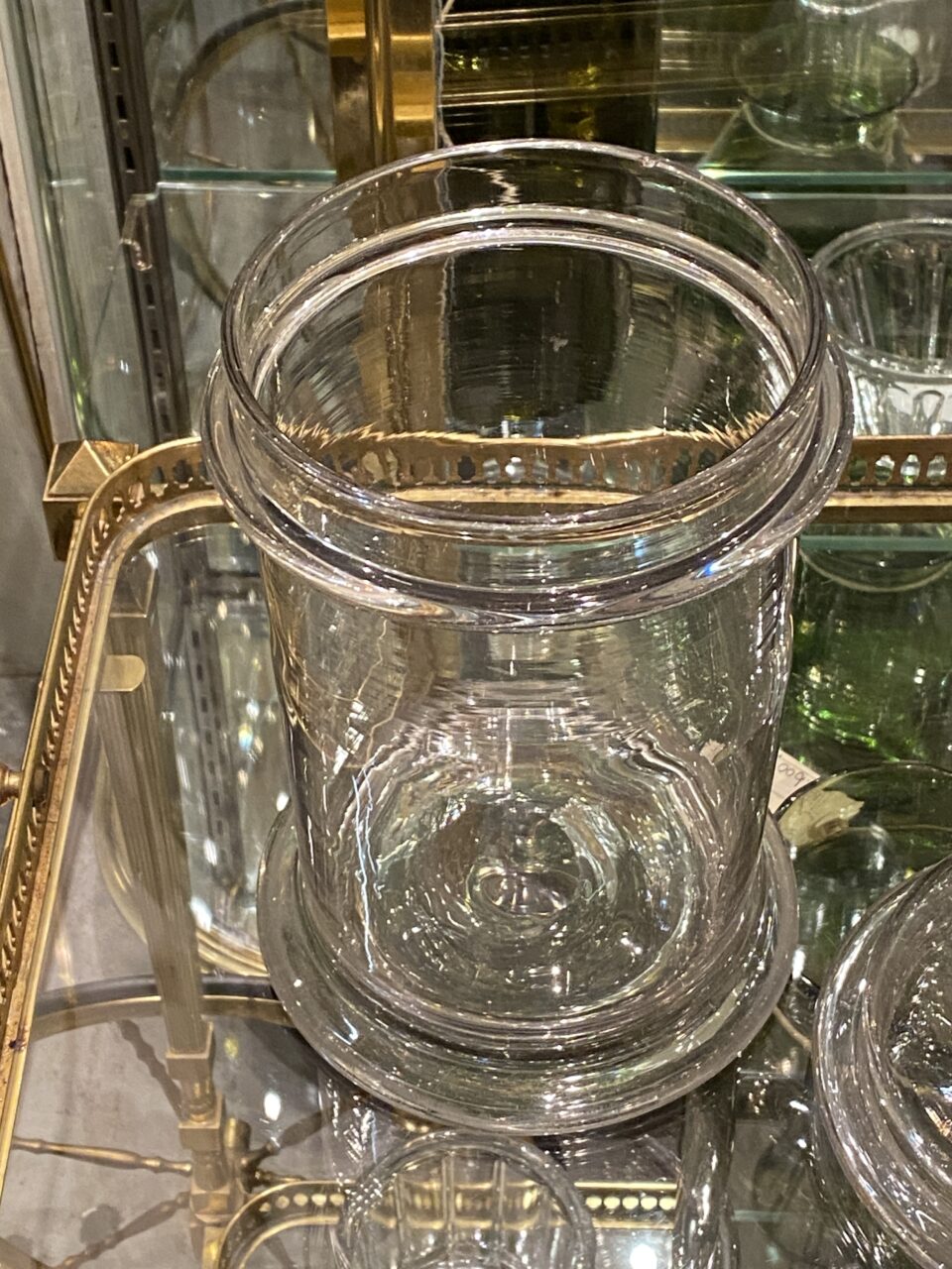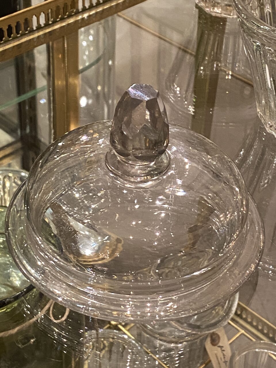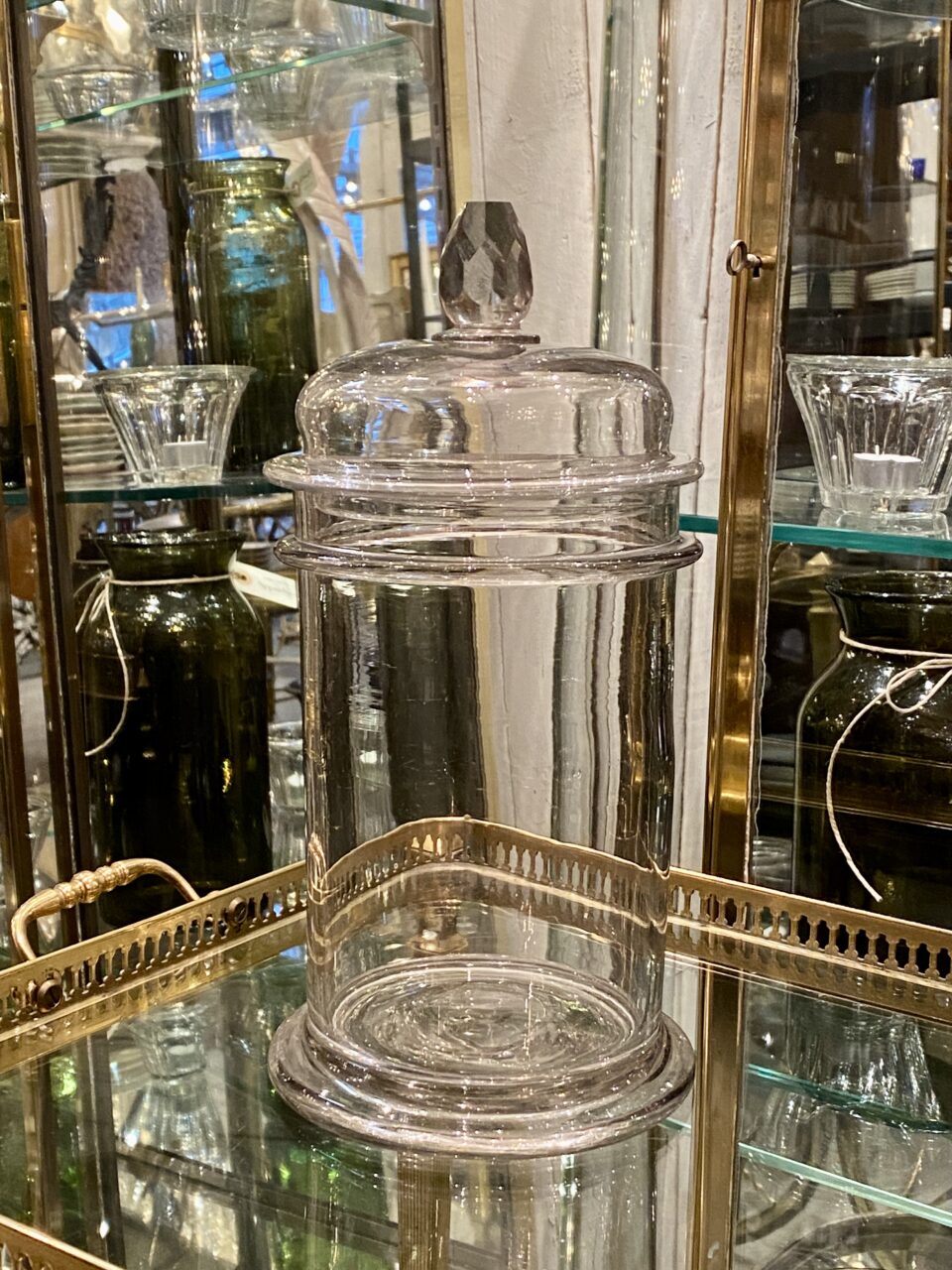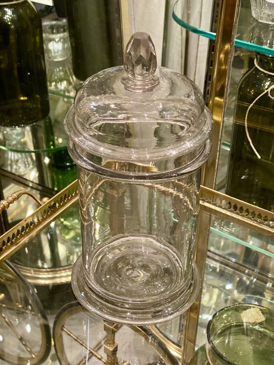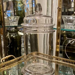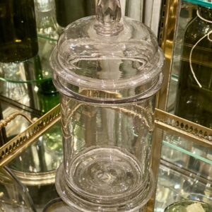 Antik stort fransk bolcheglas kaldet “pot á bonbon” i mundblæst glas med tilhørende kuppellåg med fin facetslebet knop. Glasset er fra ca. år 1880-1900. Det smukke cylinderformet opbevaringsglas har tidligere indeholdt forskellige ting såsom bolcher, småkager, marengs andre søde fristelser.