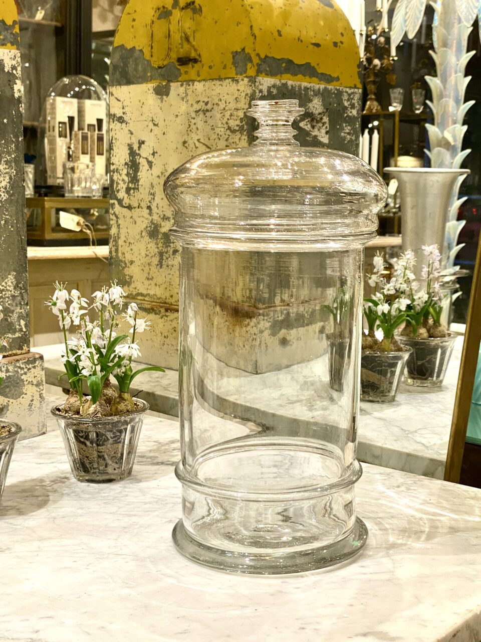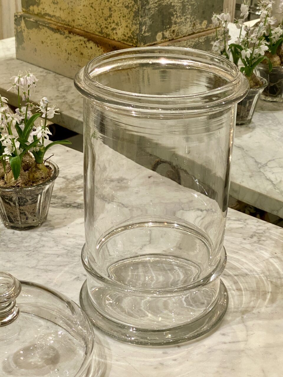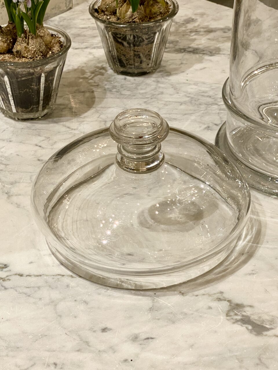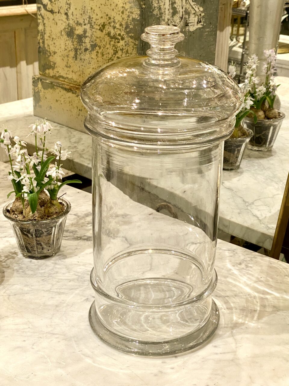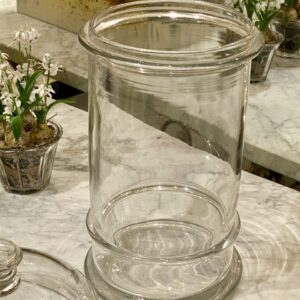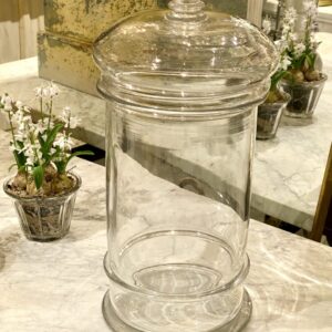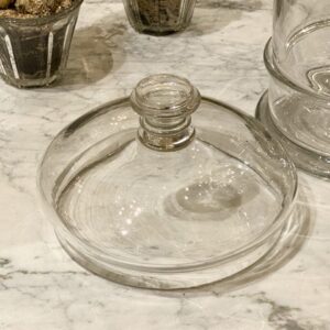 Antik og sjældent meget stort fransk bolcheglas kaldet “pot á bonbon” i mundblæst glas med tilhørende kuppellåg med fin knop. Glasset er fra ca. år 1880-1900. Det smukke cylinderformet opbevaringsglas har tidligere indeholdt forskellige ting såsom bolcher, småkager, marengs og andre søde fristelser.