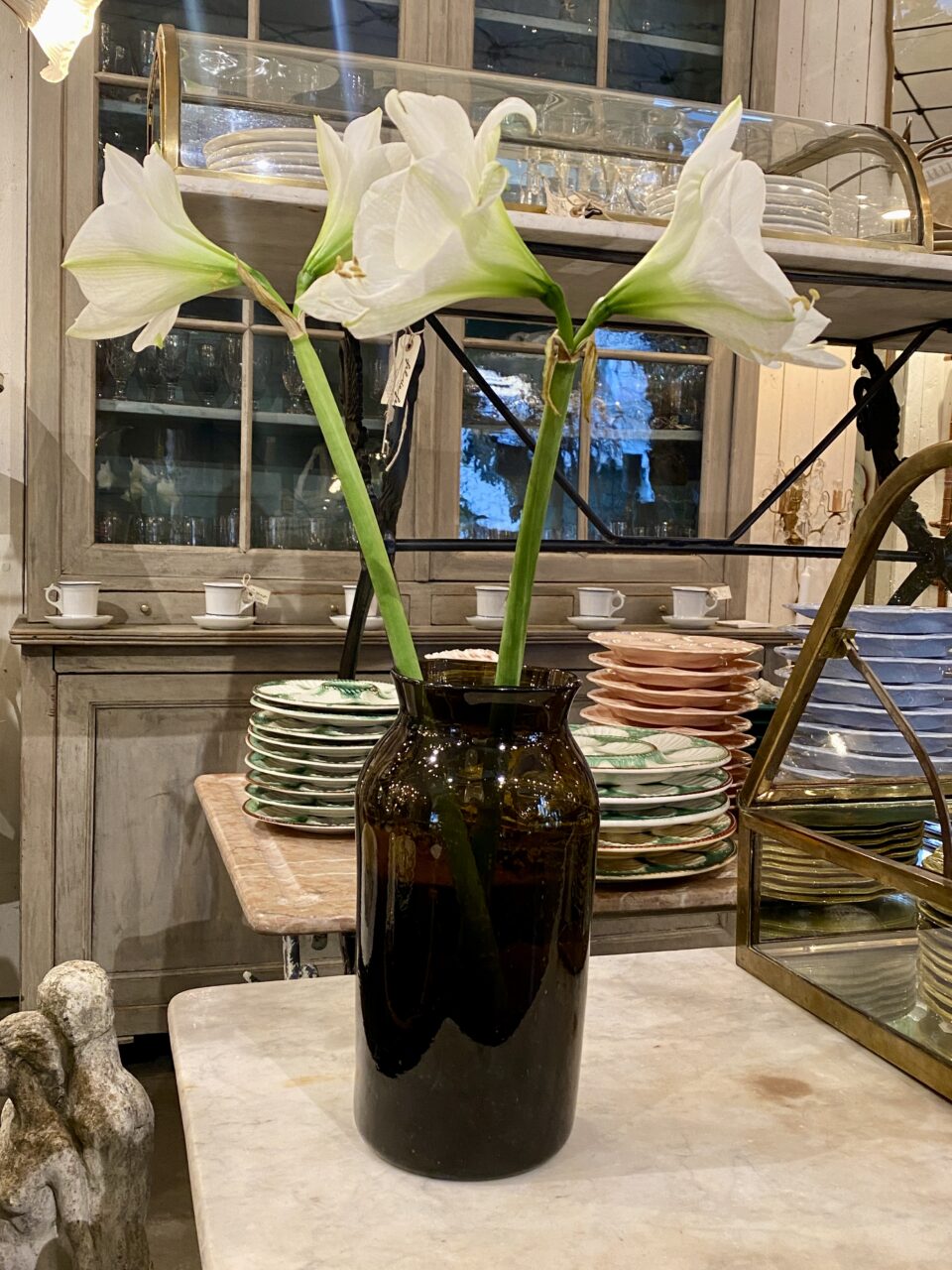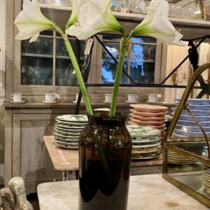 Stort antikt mundblæst sylteglas i en skøn grøn farve. Fantastisk blomstervase eller som dekoration til din bolig. Vaserne er oprindeligt blevet brugt til at opbevare syltet madvare i, herunder cornichoner, hvorfra glassene også går under navnet ‘Pot á Cornichon’.