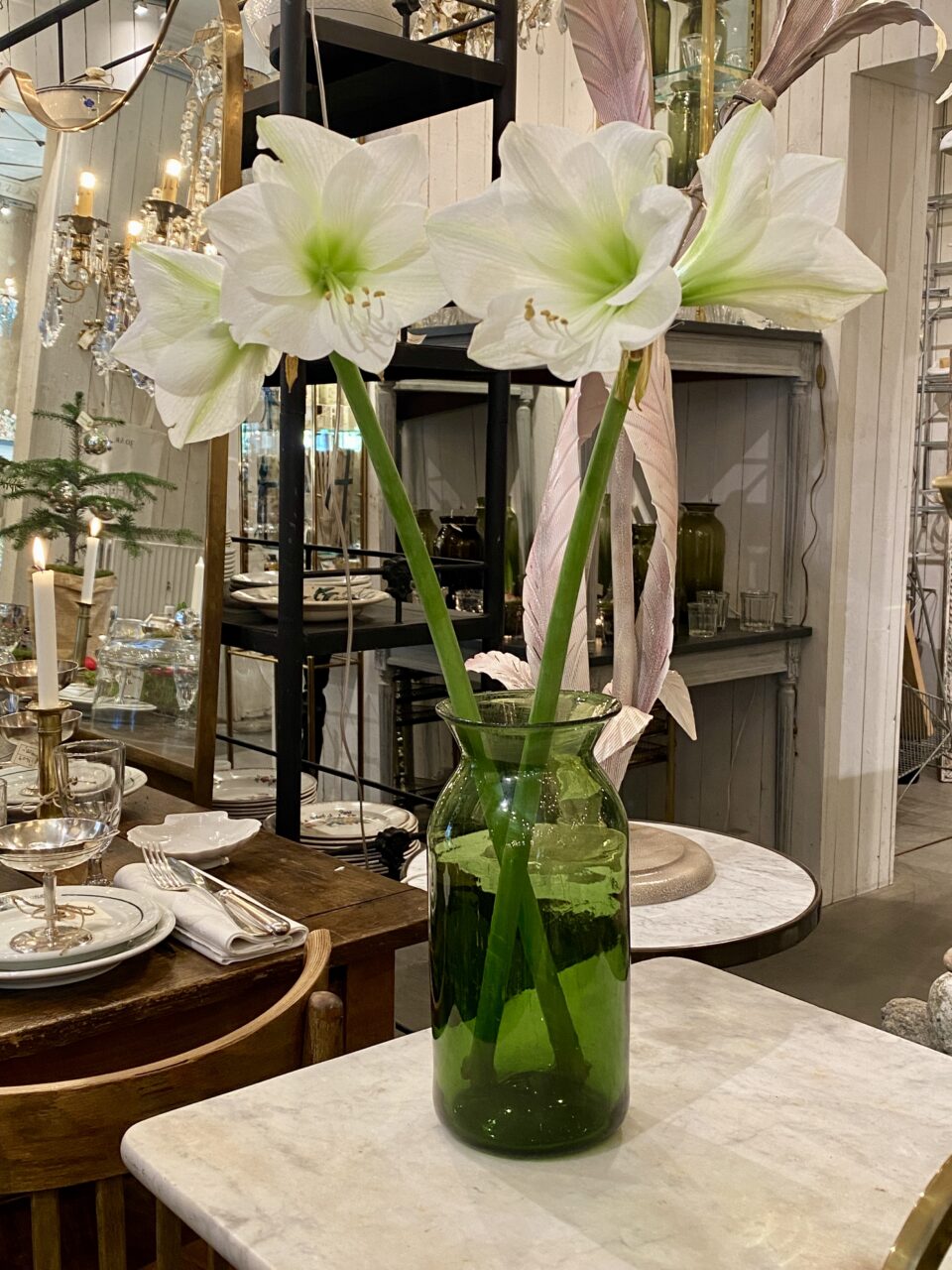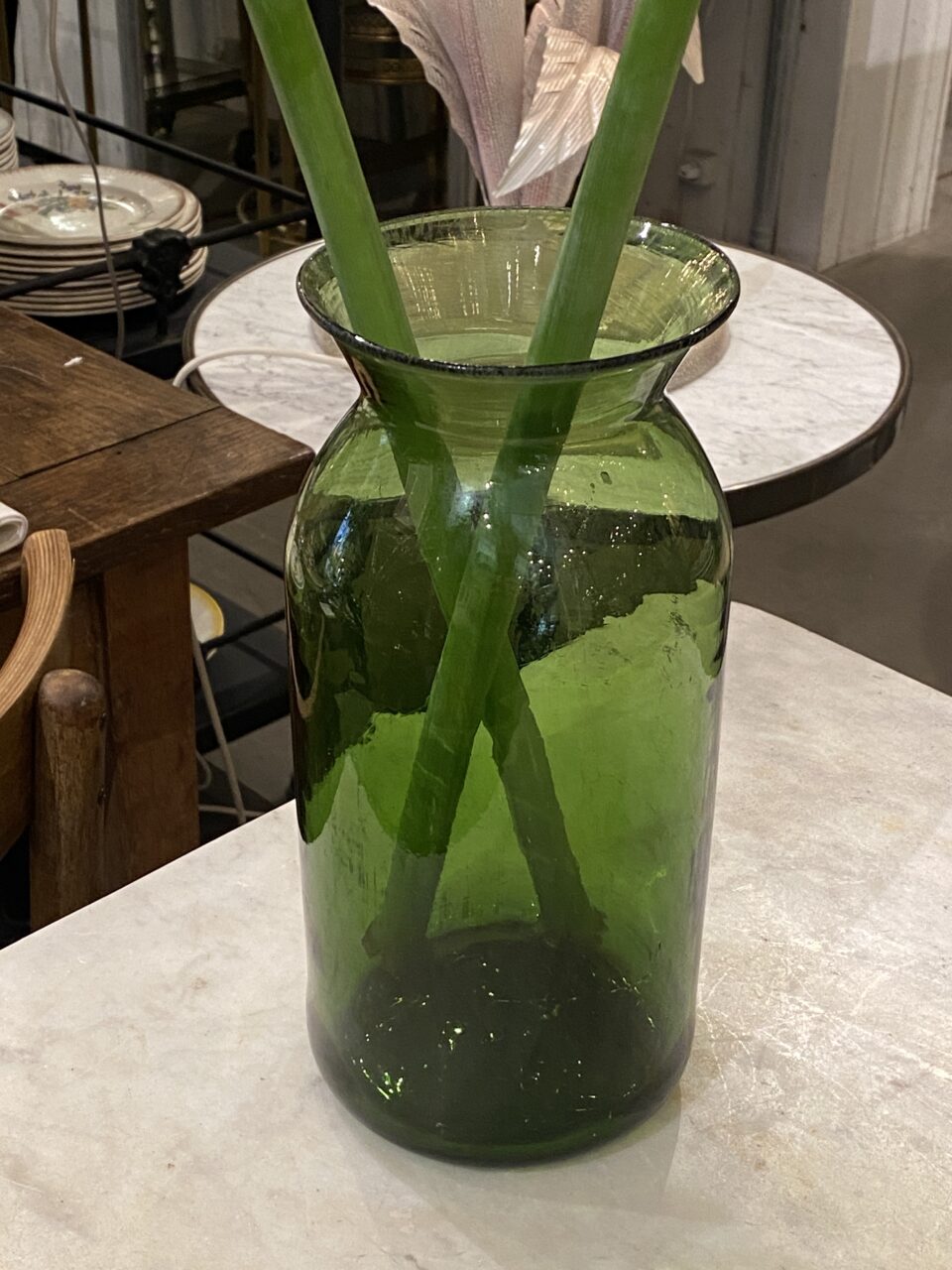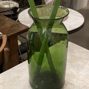 Stort antikt mundblæst sylteglas i en skøn grøn farve. Fantastisk blomstervase eller som dekoration til din bolig. Vaserne er oprindeligt blevet brugt til at opbevare syltet madvare i, herunder cornichoner, hvorfra glassene også går under navnet ‘Pot á Cornichon.