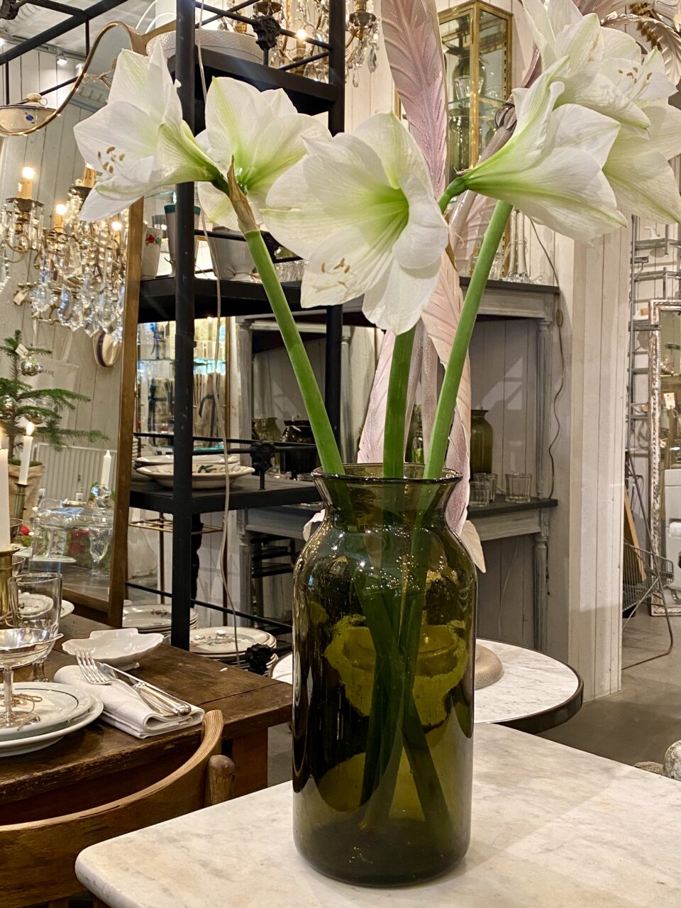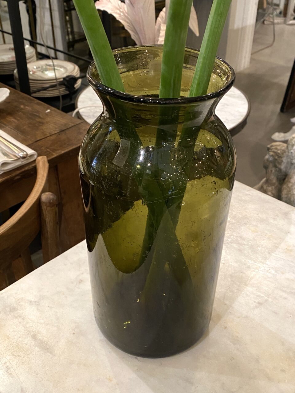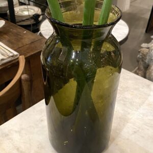 Stort antikt mundblæst sylteglas i en skøn grøn farve. Fantastisk blomstervase eller som dekoration til din bolig. Vaserne er oprindeligt blevet brugt til at opbevare syltet madvare i, herunder cornichoner, hvorfra glassene også går under navnet ‘Pot á Cornichon’.