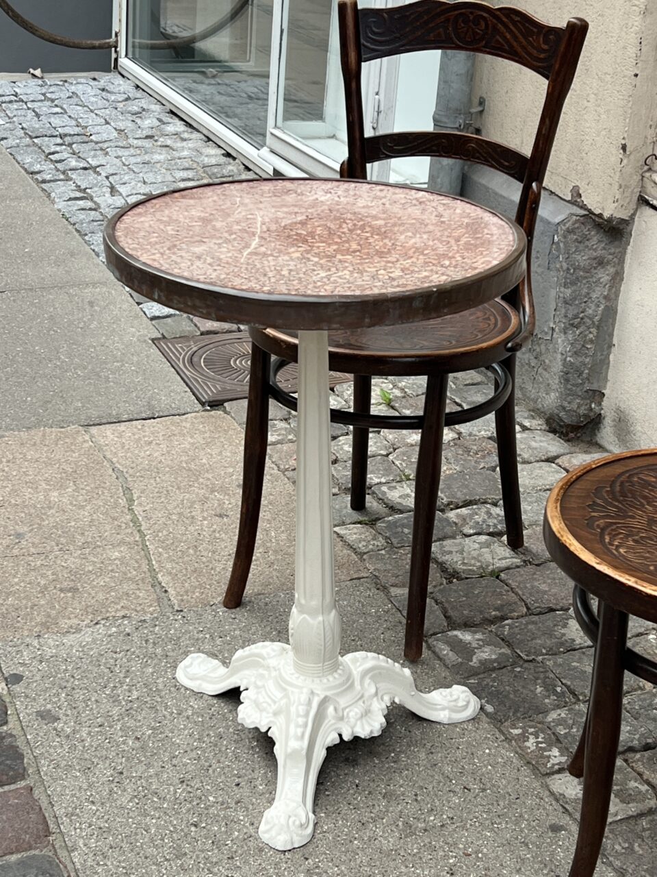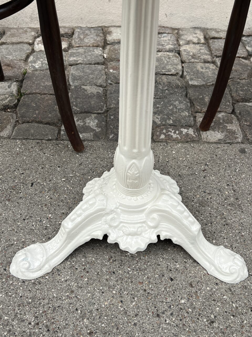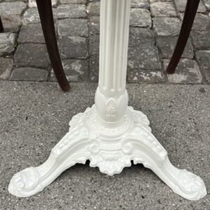 Bordet har et gedignt råhvid bemalet støbejernsunderstel.