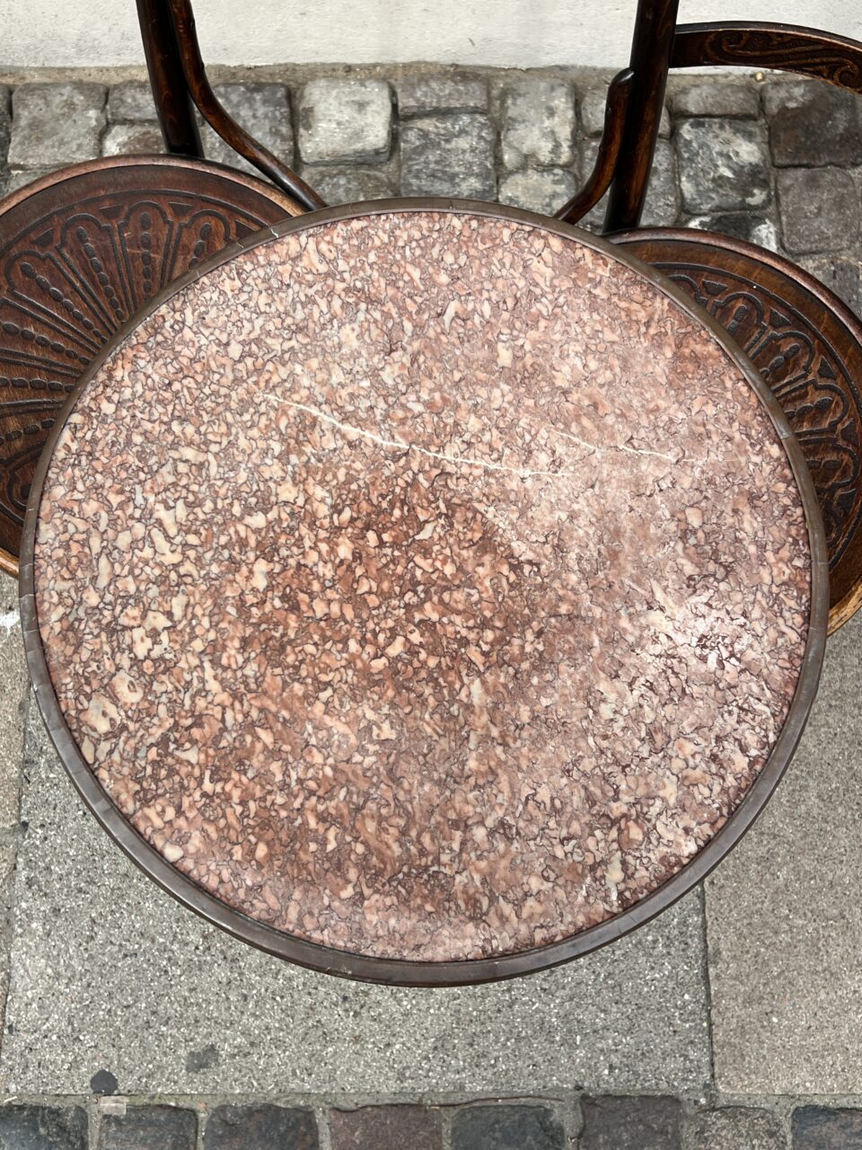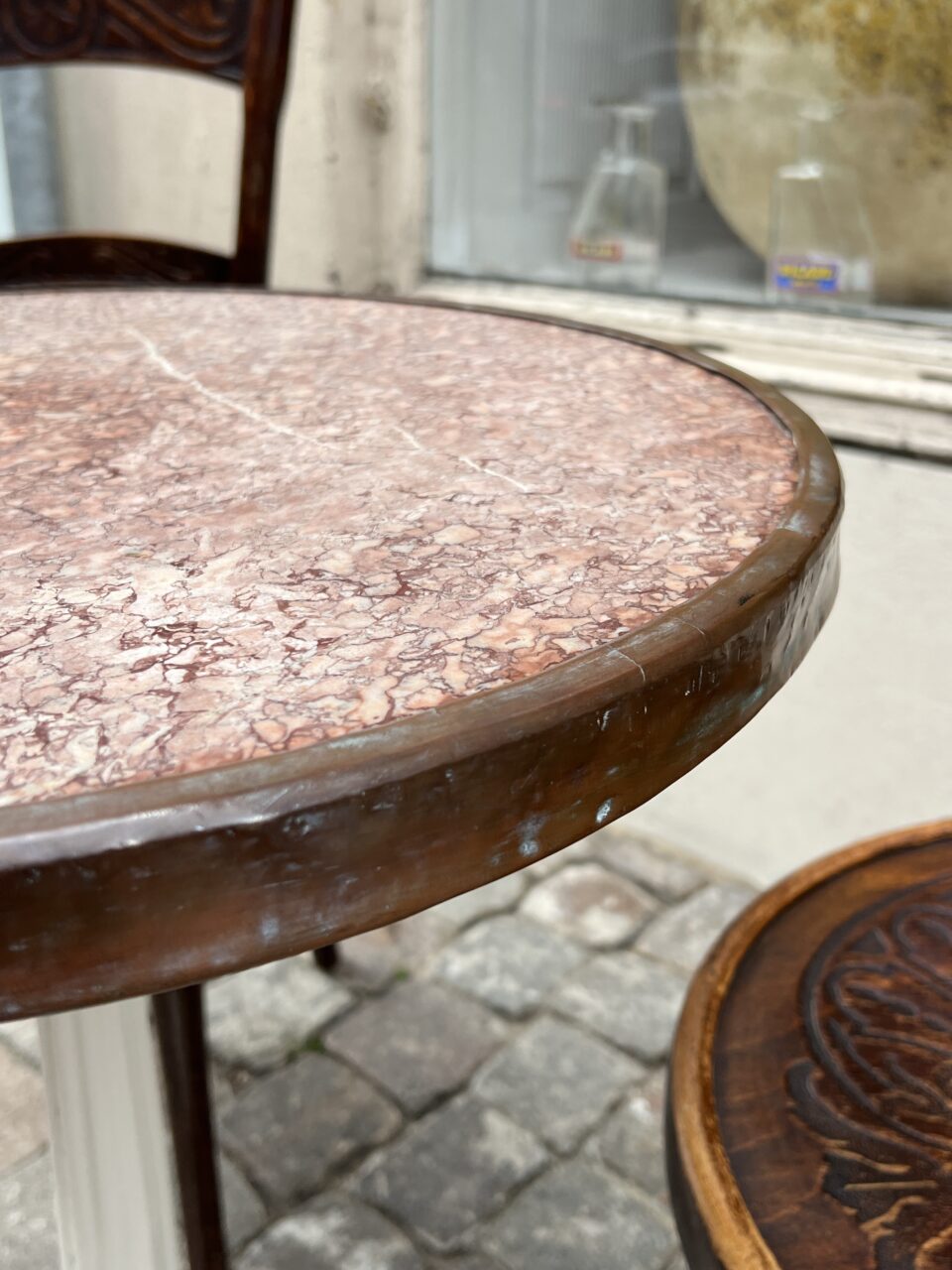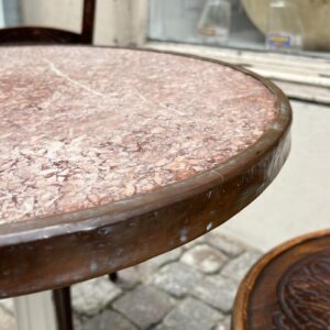Gammelt fransk Café / Bistro marmorbord fra omkring 1930 erne, med en smuk rund rød granit bordplade omkranset af en rå messingkant i fantastisk patina.